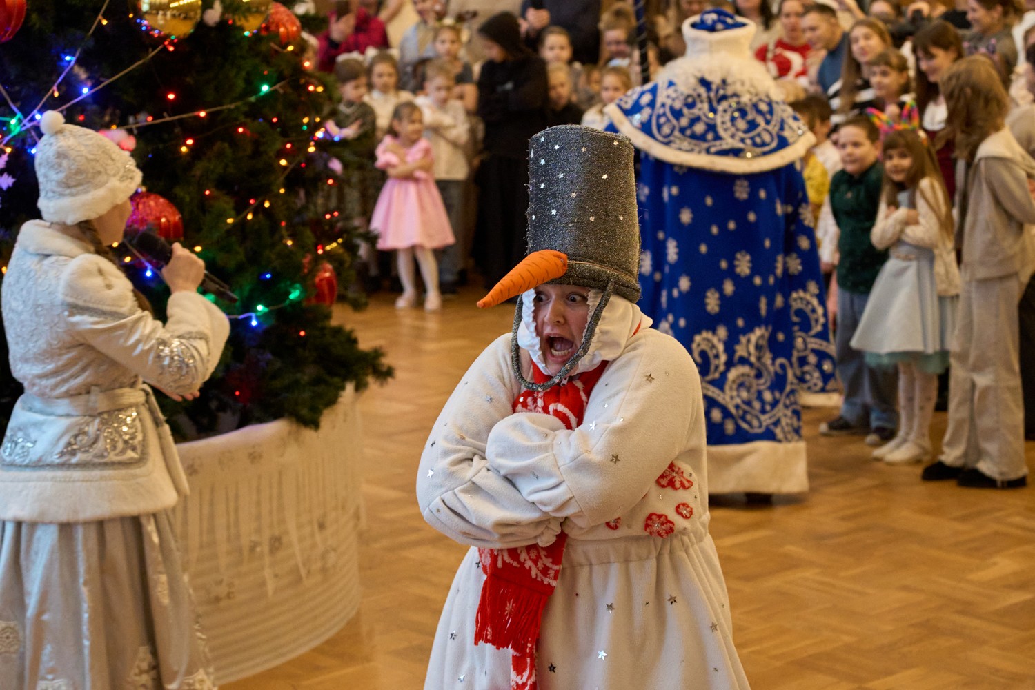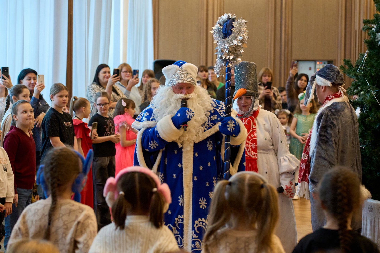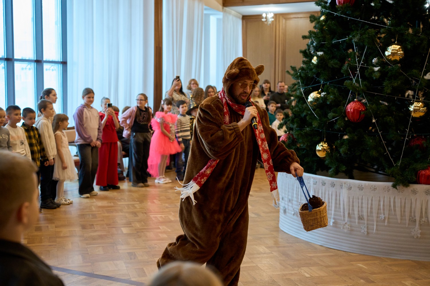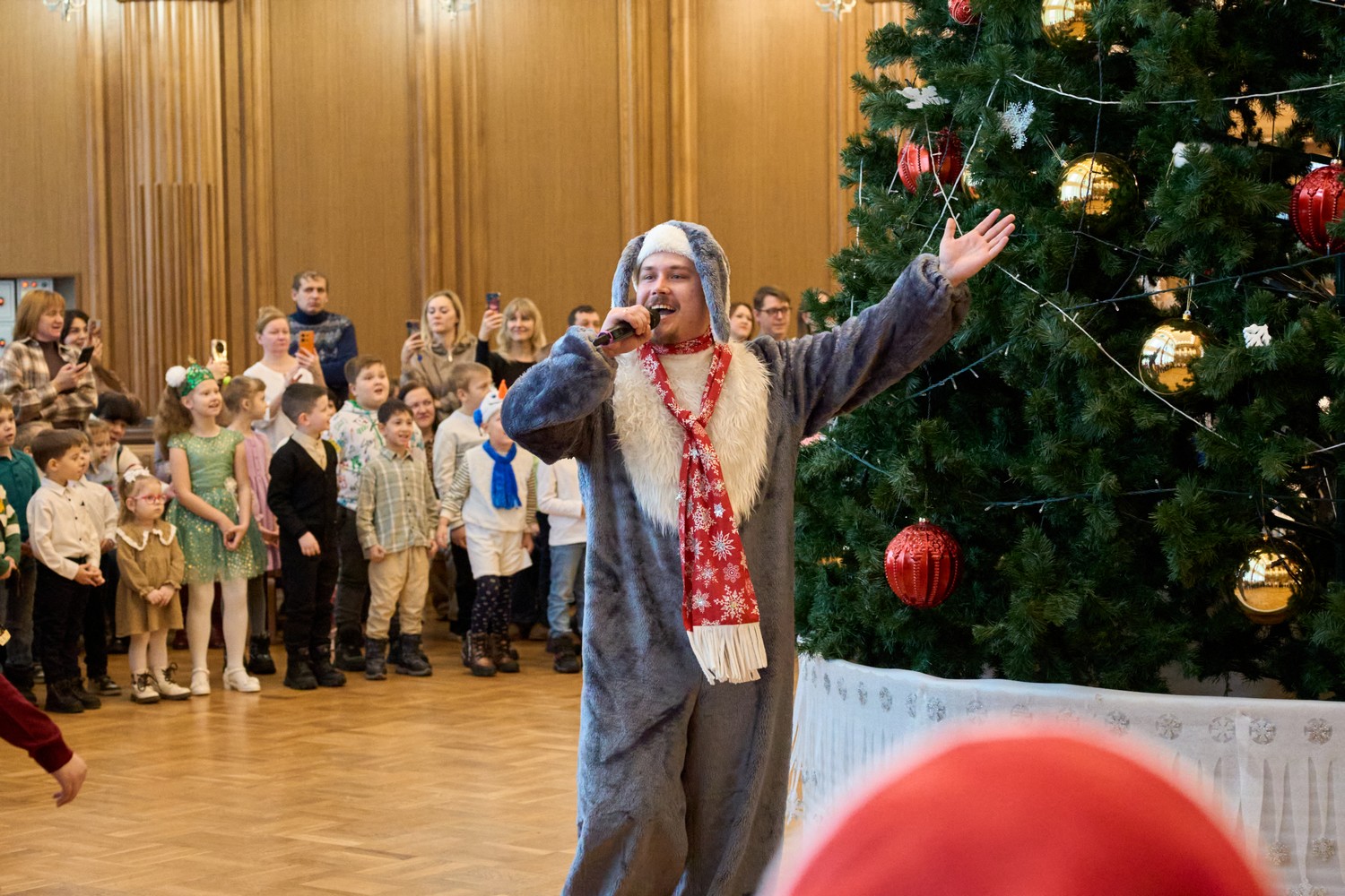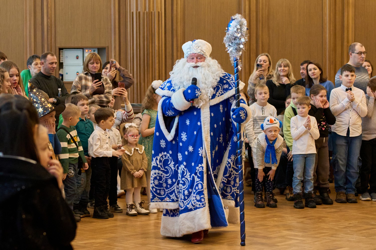 В Органном зале филармонии, у красавицы‑ёлки, юных гостей встретили сказочные герои — весёлый Снеговик, озорной Зайчик и стильный Мишка. В компании любимых персонажей ребята пели новогодние песни, водили хоровод и играли в задорные игры. А затем дружно позвали Деда Мороза и Снегурочку, чтобы вместе зажечь сверкающие огни на ёлке.
