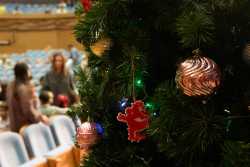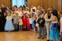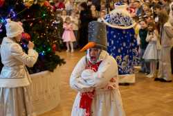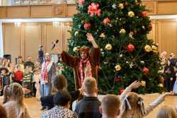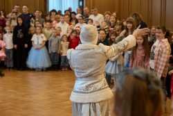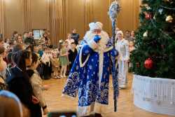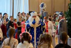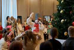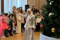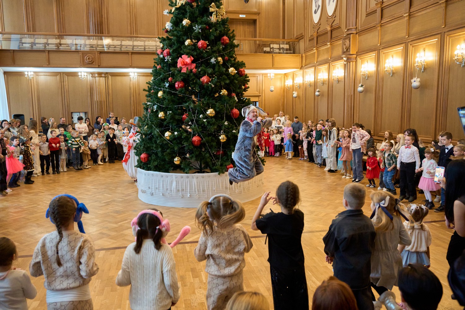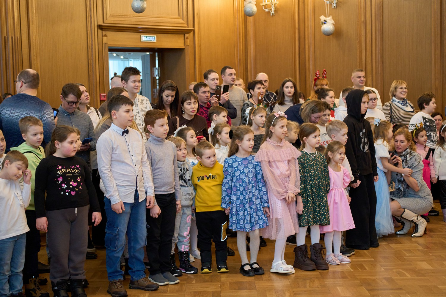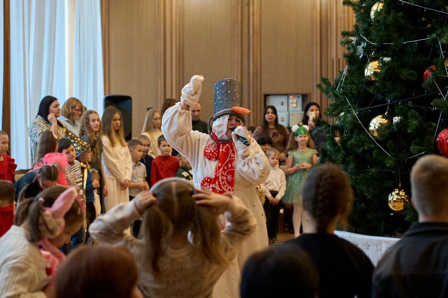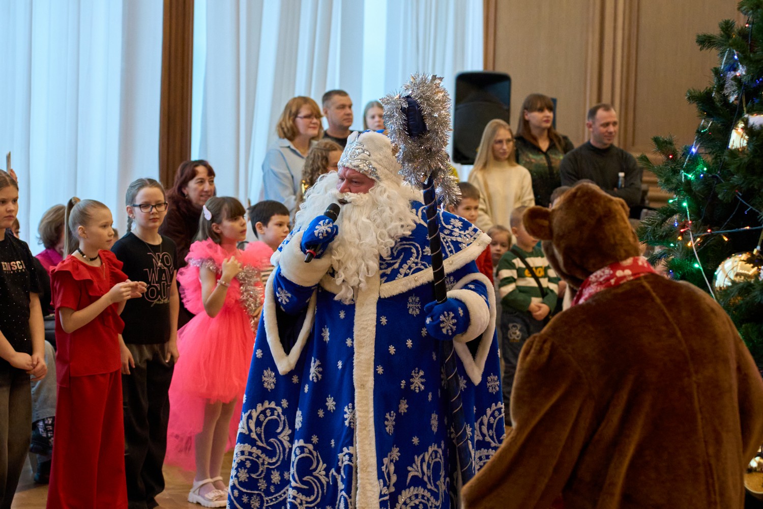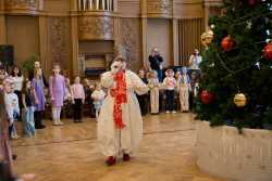 В Органном зале филармонии, у красавицы‑ёлки, юных гостей встретили сказочные герои — весёлый Снеговик, озорной Зайчик и стильный Мишка. В компании любимых персонажей ребята пели новогодние песни, водили хоровод и играли в задорные игры. А затем дружно позвали Деда Мороза и Снегурочку, чтобы вместе зажечь сверкающие огни на ёлке.