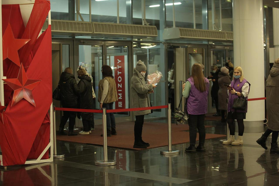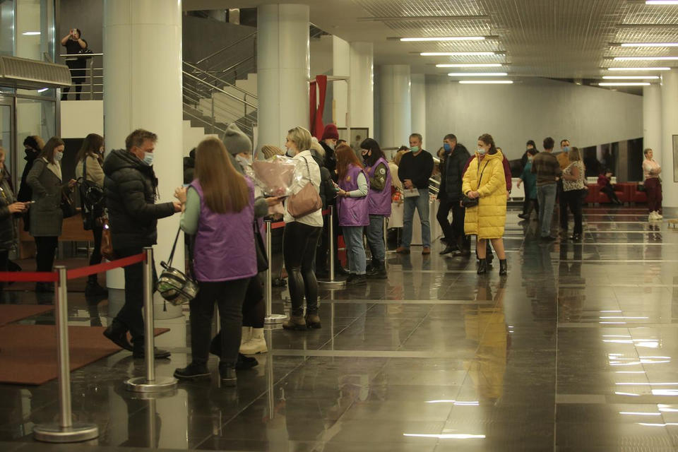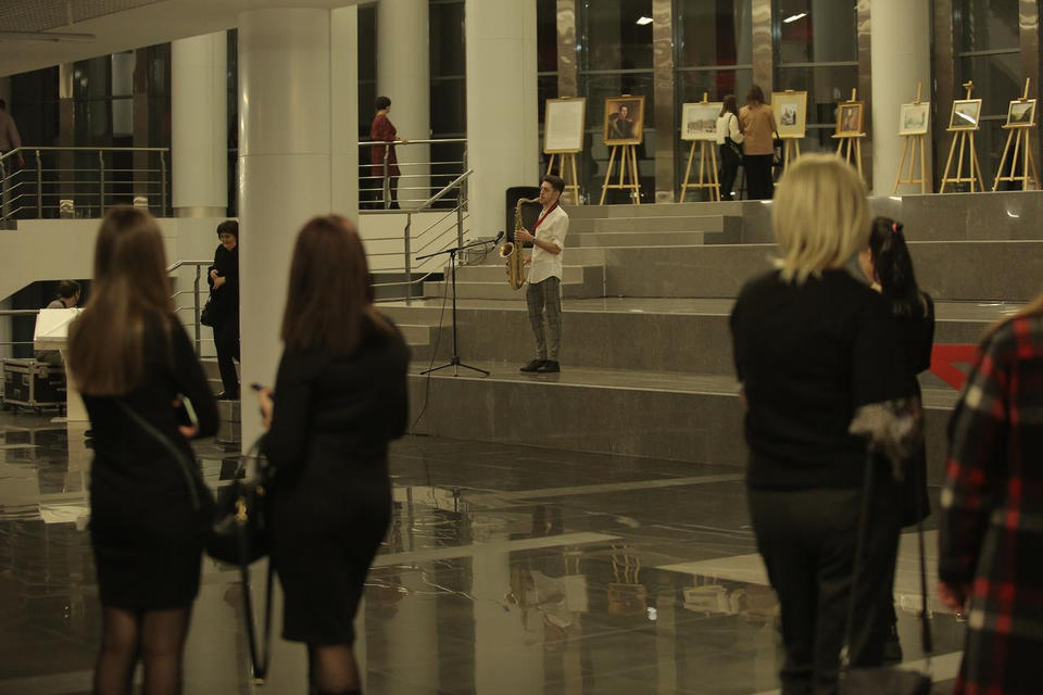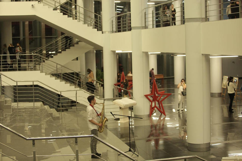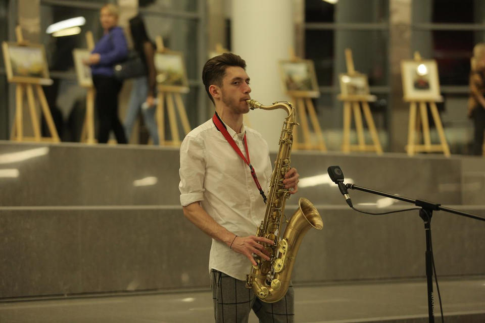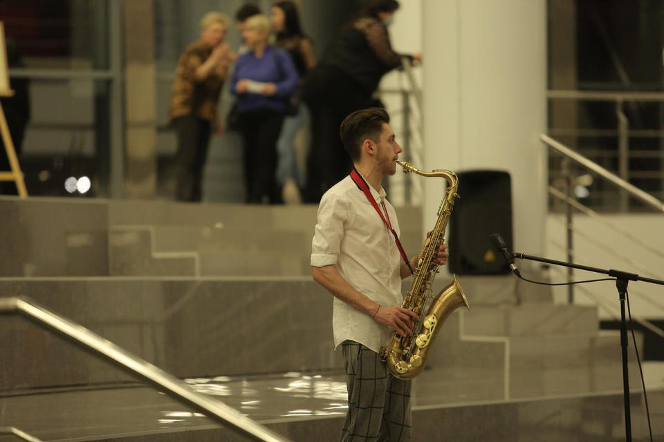 Перед концертом зрителей с программой «Добро пожаловать!» встречал музыкант эстрадно-джазового ансамбля «Экспресс-бэнд» Семён Бойков (саксофон).