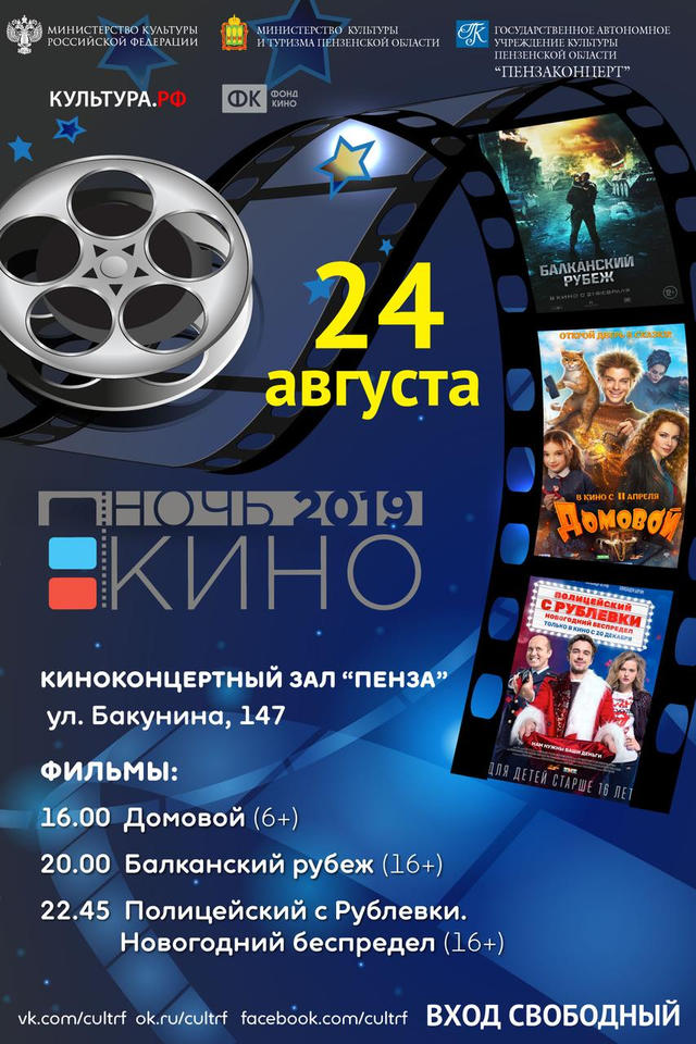 «Пензаконцерт» традиционно присоединяется к акции. В 16:00 в Киноконцертном зале «Пенза» начнётся детский кинопоказ фильма «Домовой». В 19:30 состоится открытие Всероссийской акции «Ночь кино» с участием творческих коллективов «Пензаконцерта». После зрители увидят картину «Балканский рубеж», а в 22:45 мы покажем фильм «Полицейский с Рублёвки. Новогодний беспредел», – отметила заместитель директора ГАУК ПО «Пензаконцерт» по творческой деятельности Любовь Сычёва.