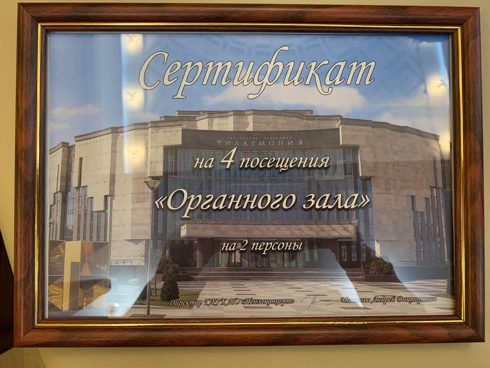 Церемония прошла в Органном зале филармонии, где юбилейной посетительнице выставки вручили сертификат на четыре посещения органных концертов.