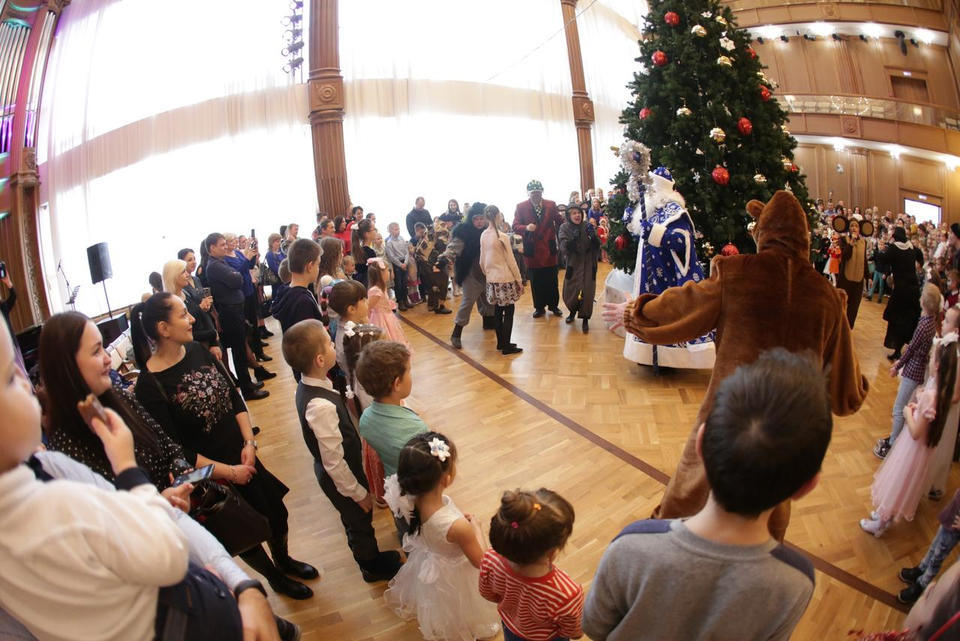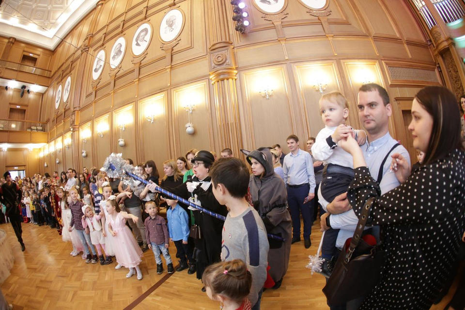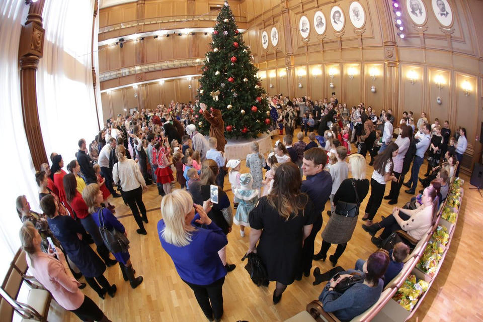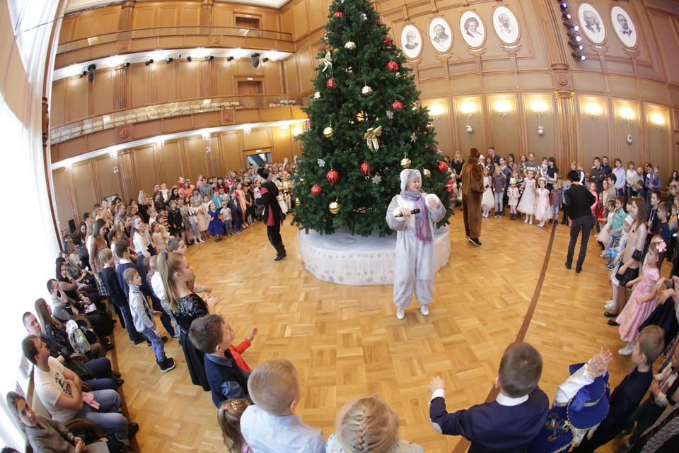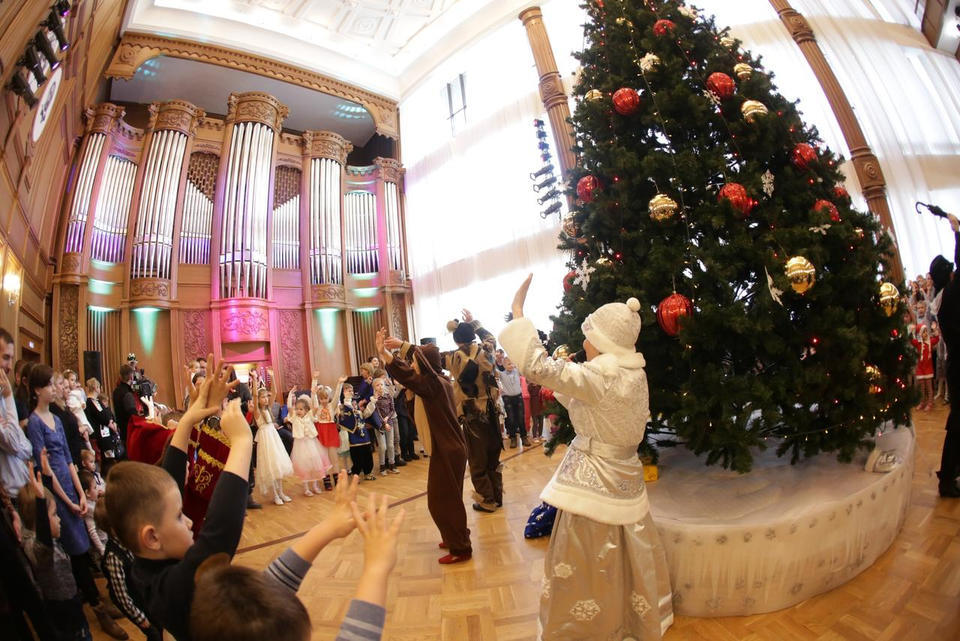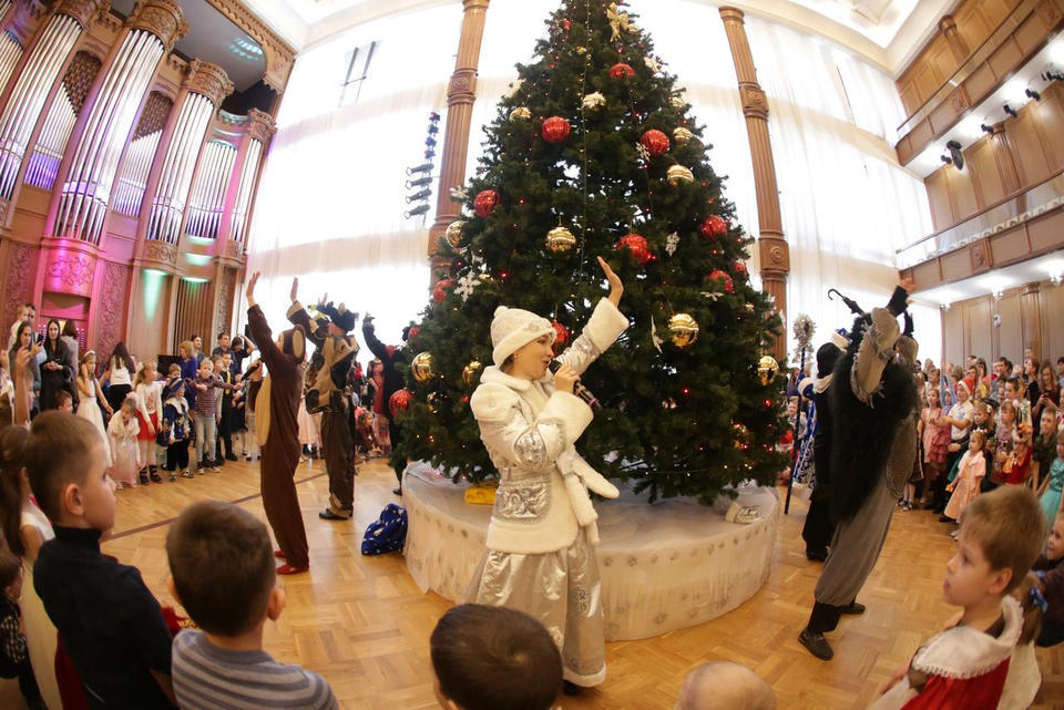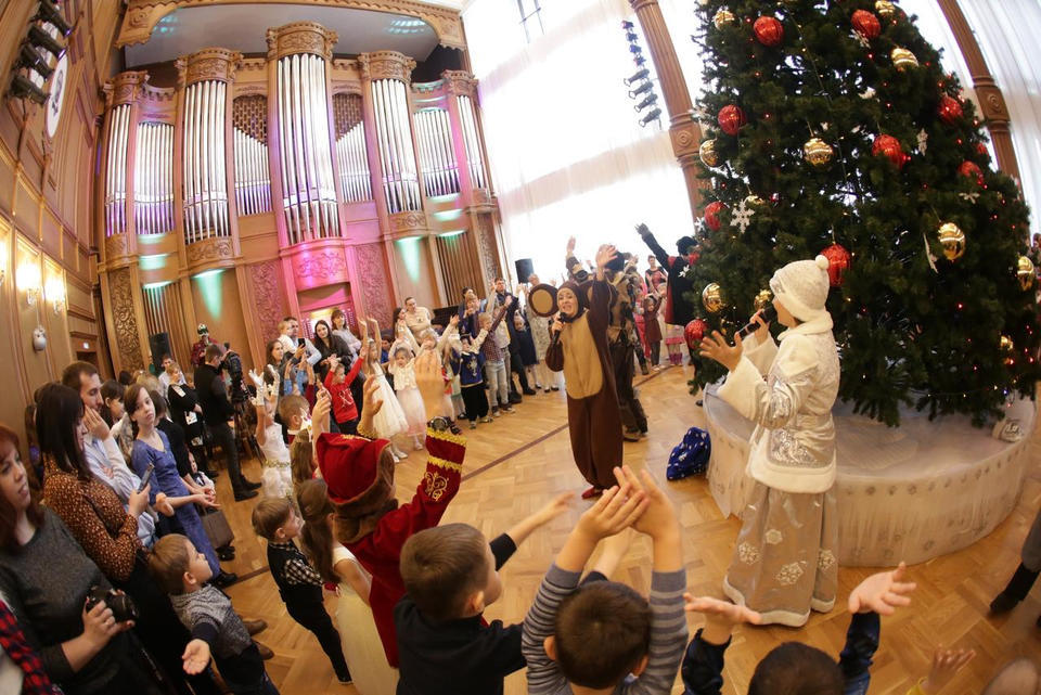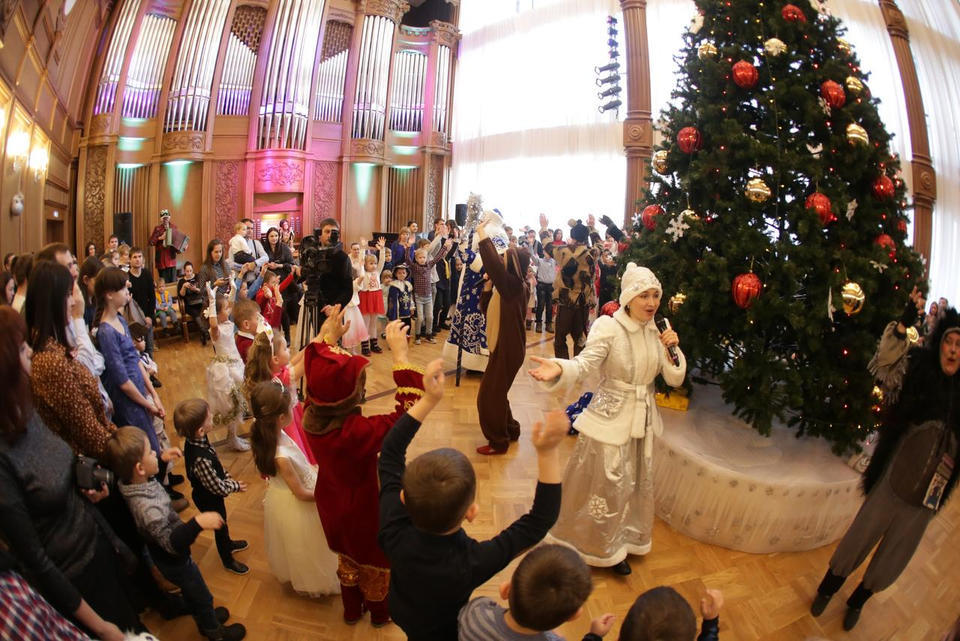 В Органном зале ансамбль русской этнической музыки «Миряне» подарил маленьким и большим гостям незабываемый хоровод вокруг красавицы-ёлки. Артисты в сопровождении Волшебного Органа (Софья Семьянова) показали увлекательное представление с песнями, танцами, конкурсами и вместе с ребятами встретили главных героев праздника – Деда Мороза и Снегурочку.