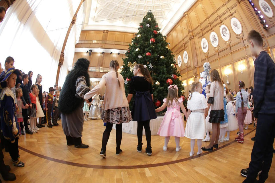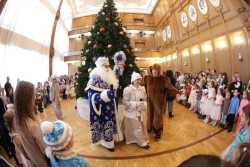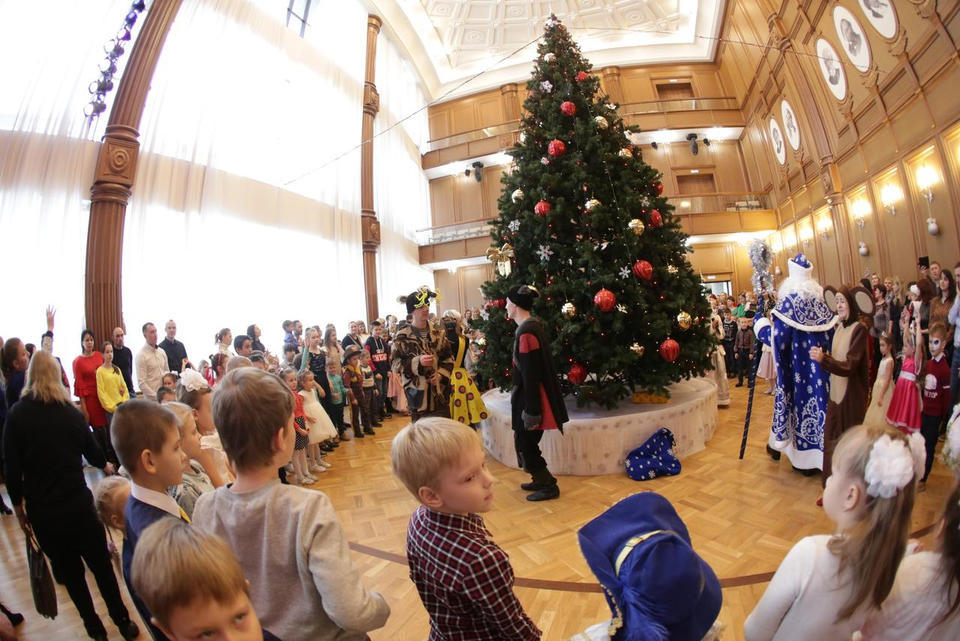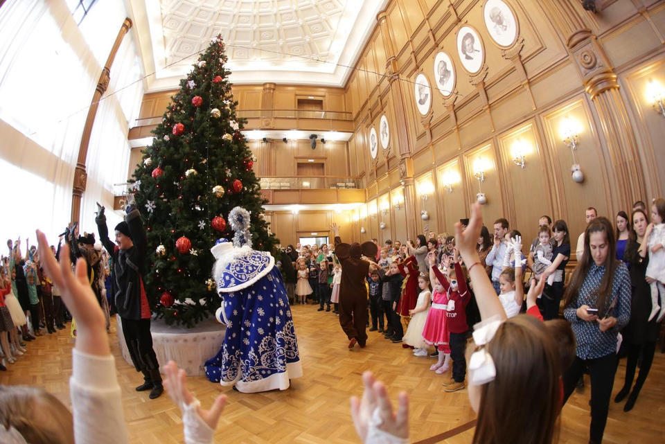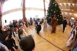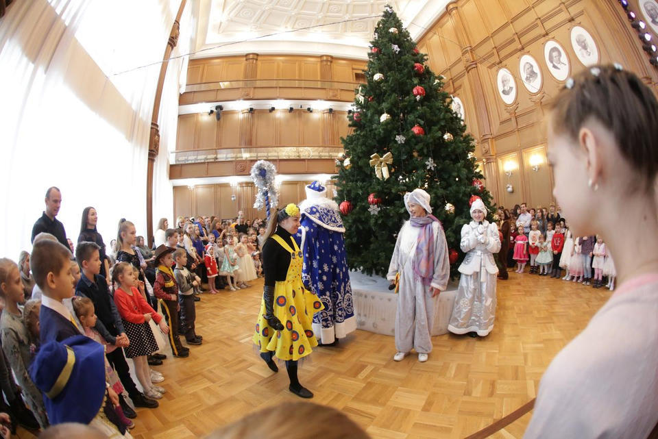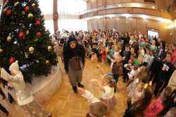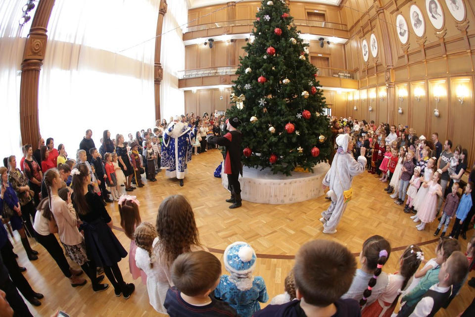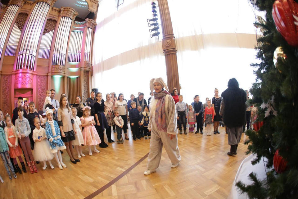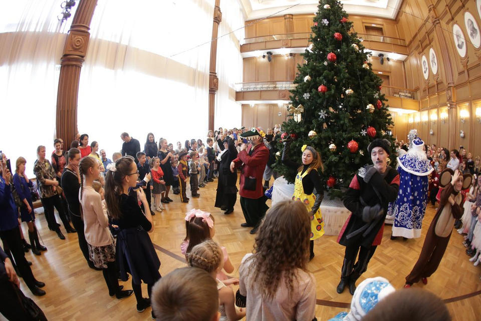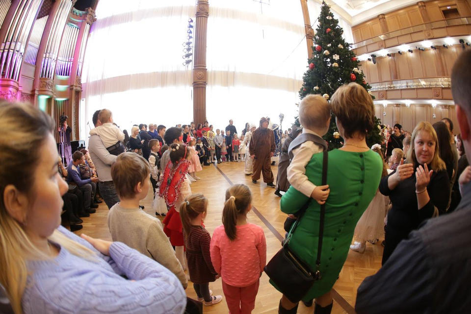В Органном зале ансамбль русской этнической музыки «Миряне» подарил маленьким и большим гостям незабываемый хоровод вокруг красавицы-ёлки. Артисты в сопровождении Волшебного Органа (Софья Семьянова) показали увлекательное представление с песнями, танцами, конкурсами и вместе с ребятами встретили главных героев праздника – Деда Мороза и Снегурочку.