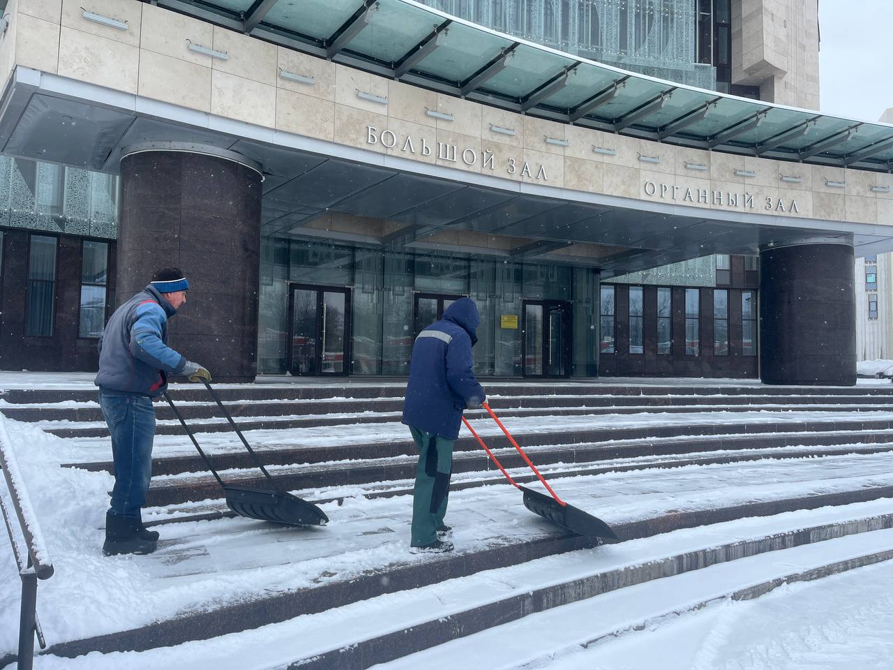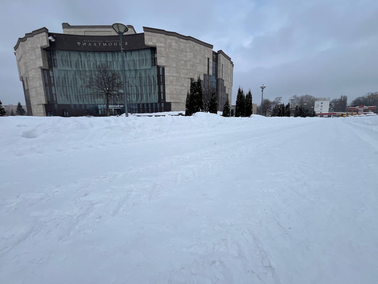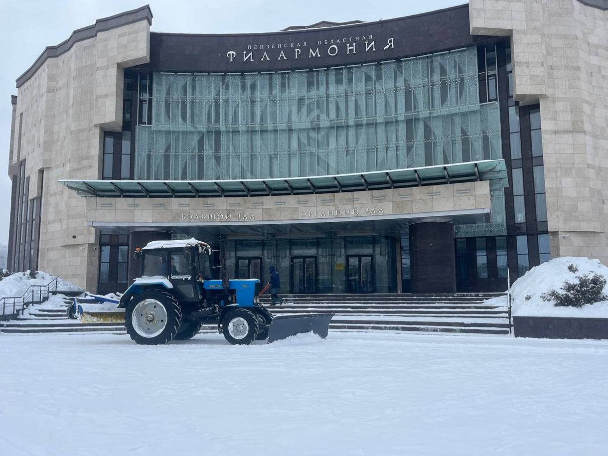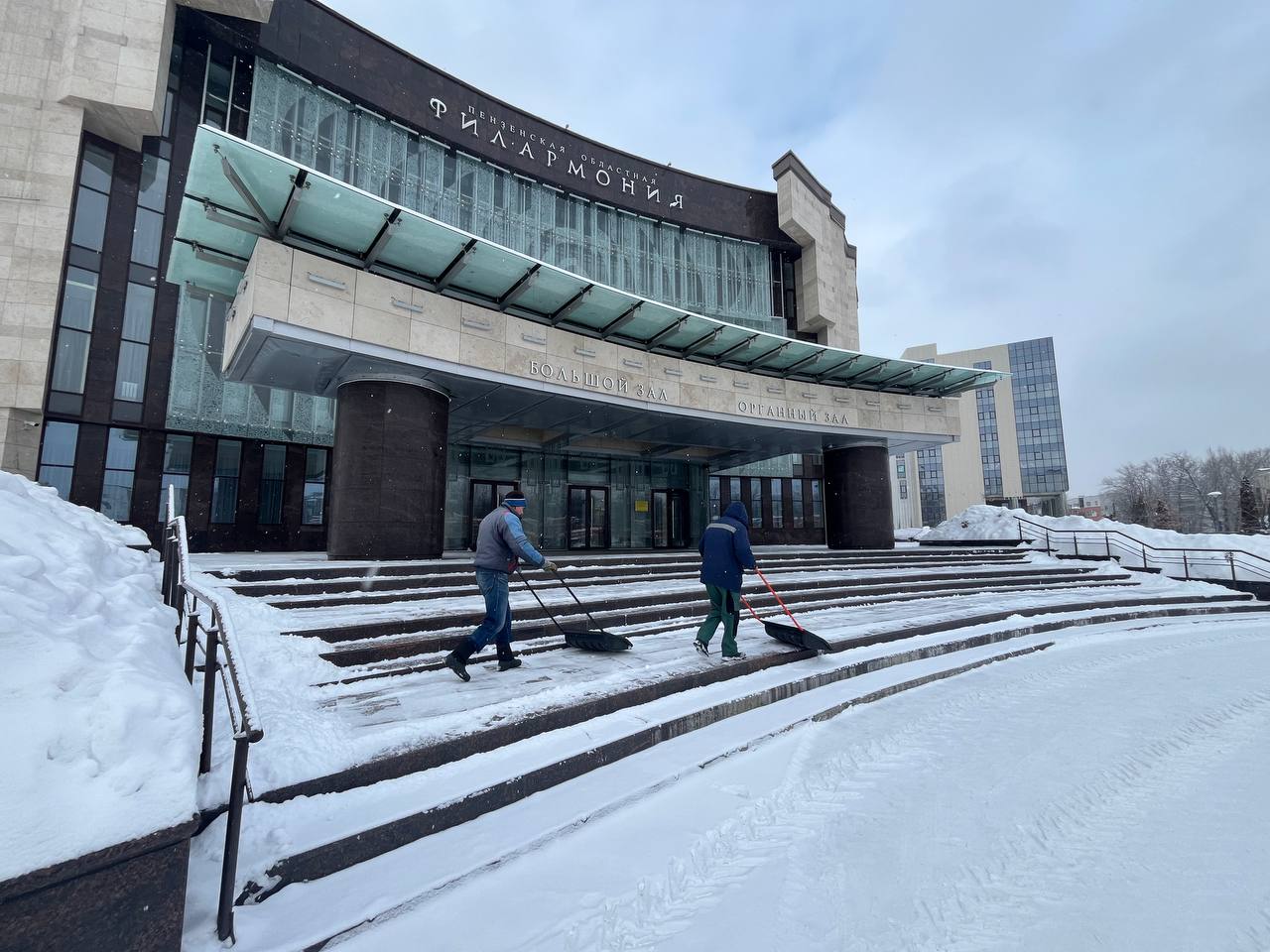 На территории «Пензаконцерта» ежедневно ведутся работы по уборке снега. Для расчистки территории используется как подручный инвентарь, так и спецтехника.