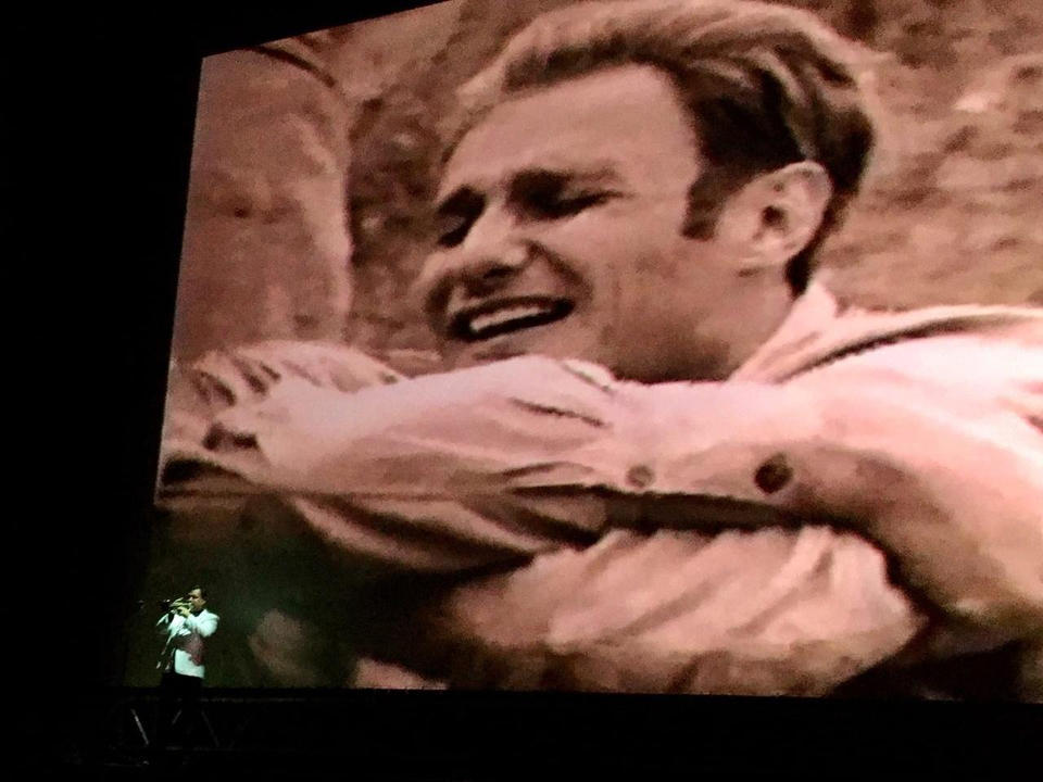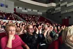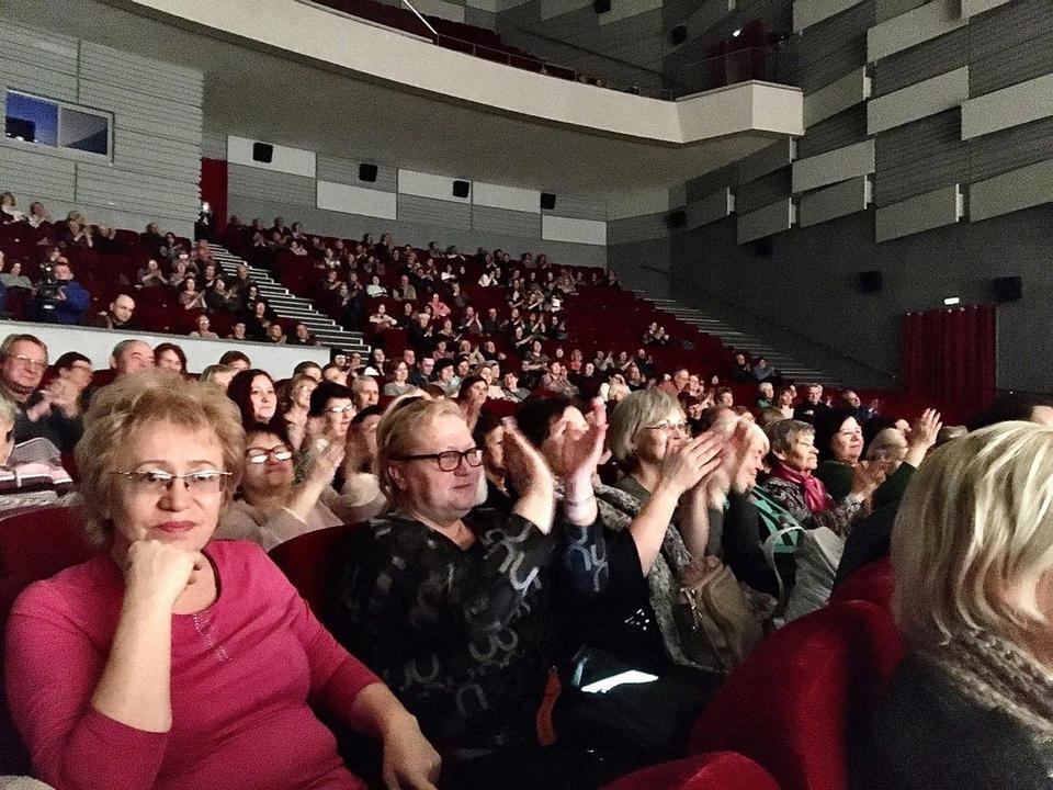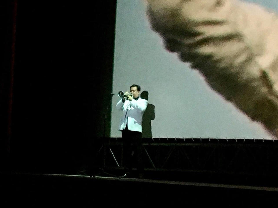 В большом концертном зале музыкальный подарок зрителям преподнёс руководитель эстрадно-джазового ансамбля «Экспресс-бэнд» Юрий Белоногов (труба).