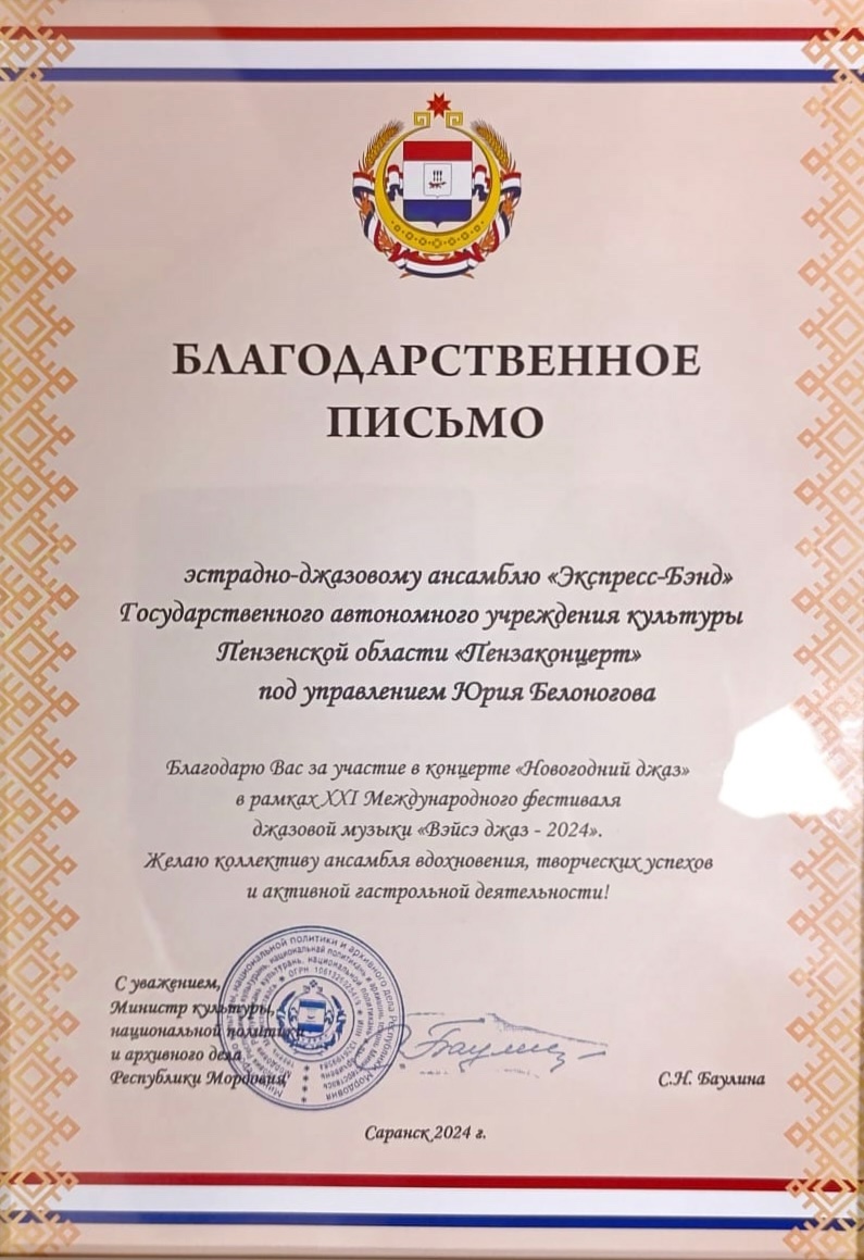 Концерт состоялся 22 декабря в Республиканском дворце культуры в городе Саранске в рамках ХХІ Международного фестиваля джазовой музыки «Вэйсэ джаз - 2024».