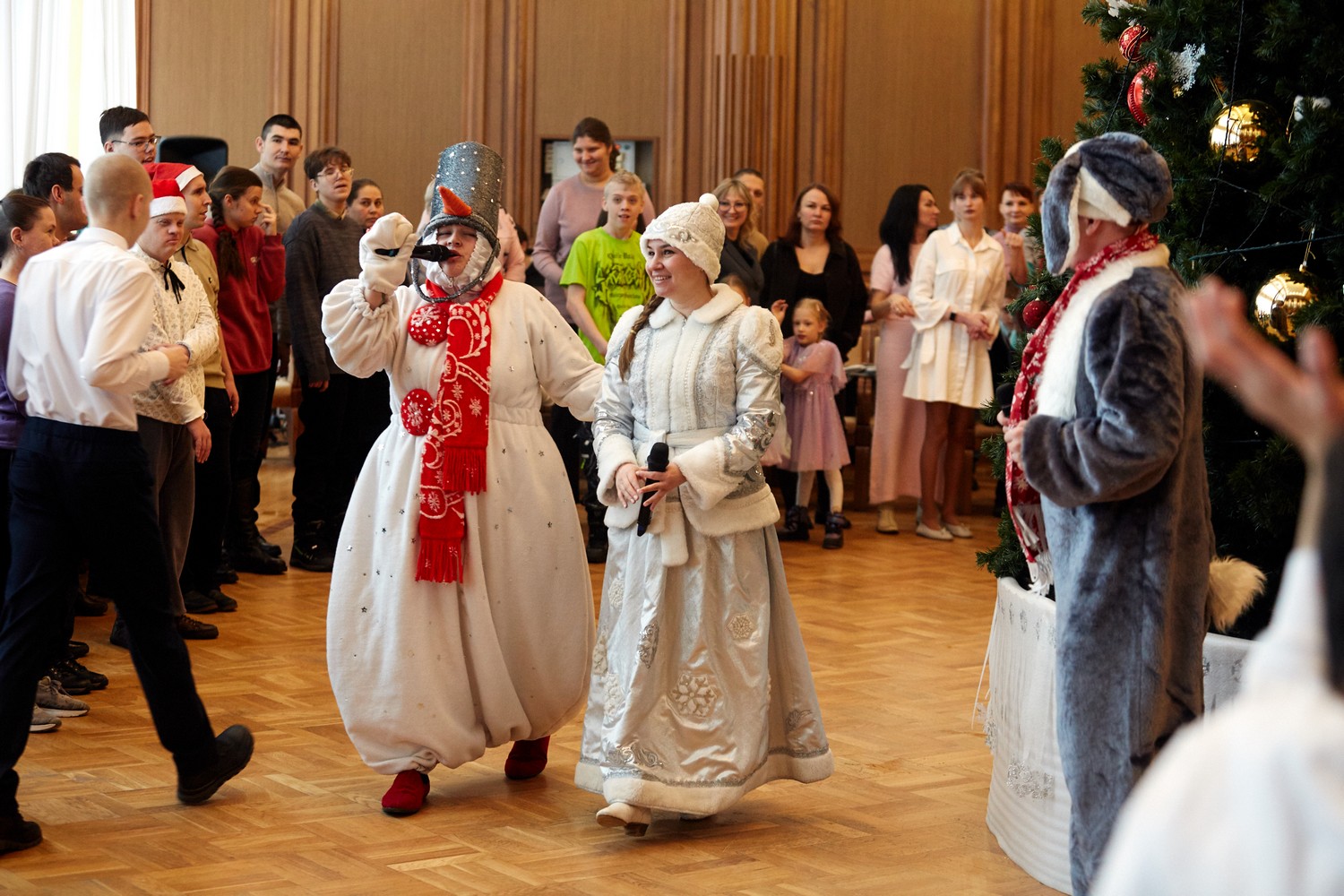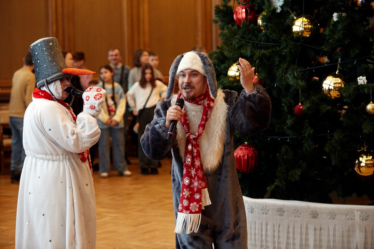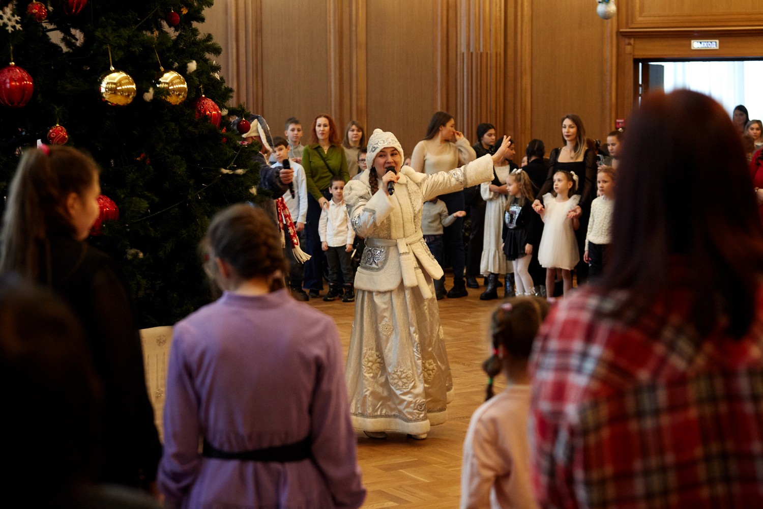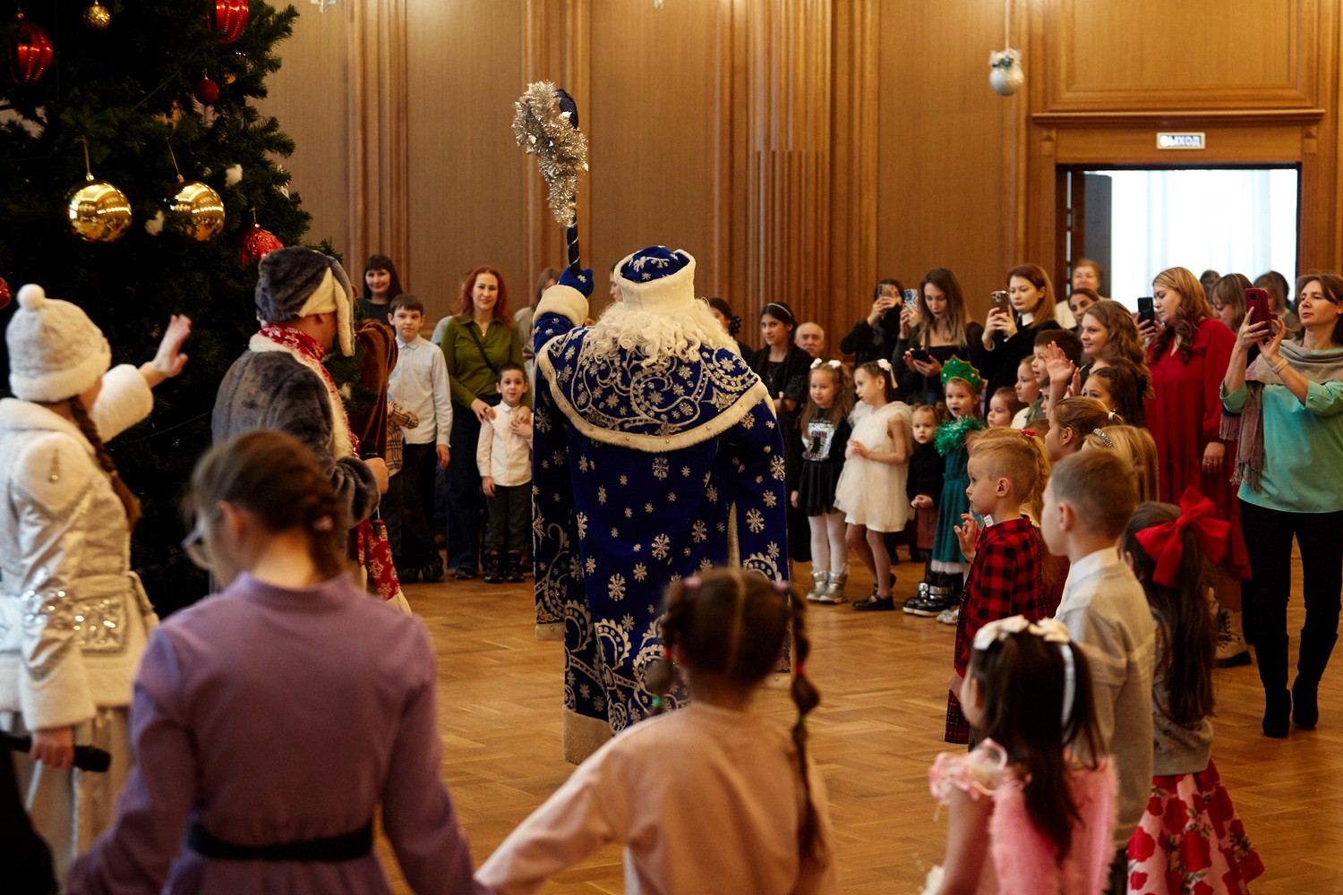 Праздник начался в Органном зале. Юные гости отгадывали новогодние загадки, пели песни и водили хоровод вокруг нарядной ёлки вместе с забавными сказочными героями, Дедом Морозом и Снегурочкой. Затем в Большом зале группа «Калейдоскоп» представила музыкальное представление «Золушка».