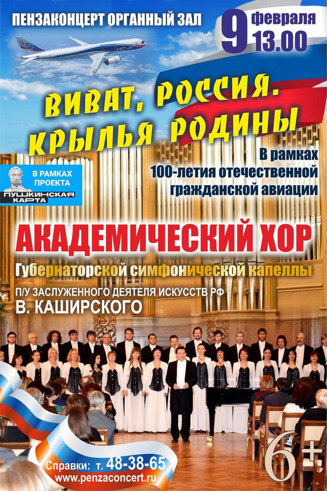 В рамках празднования 100-летия отечественной гражданской авиации состоится литературно-музыкальная композиция «Виват, Россия! Крылья Родины» (6+) в исполнении академического хора Губернаторской симфонической капеллы под управлением Заслуженного деятеля искусств России Владимира Каширского.