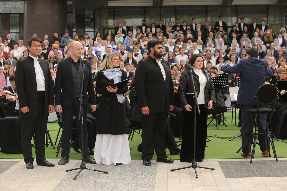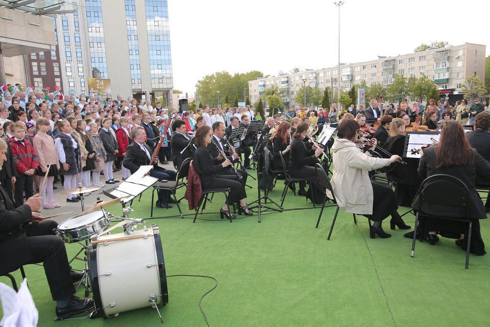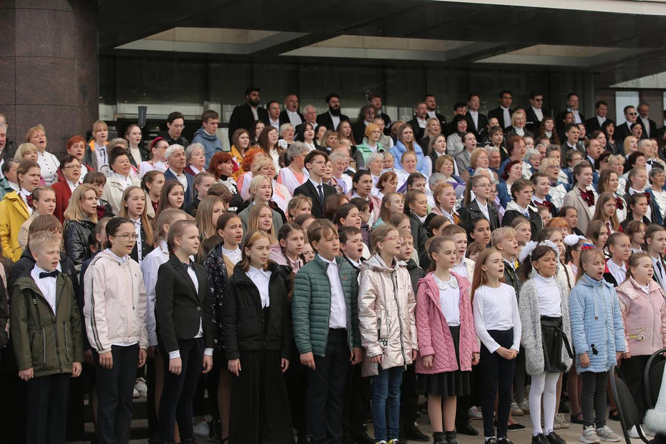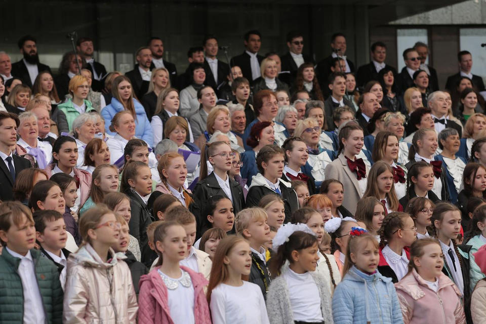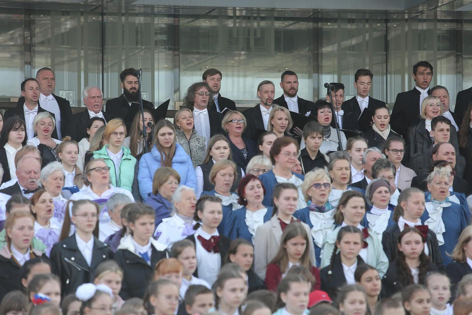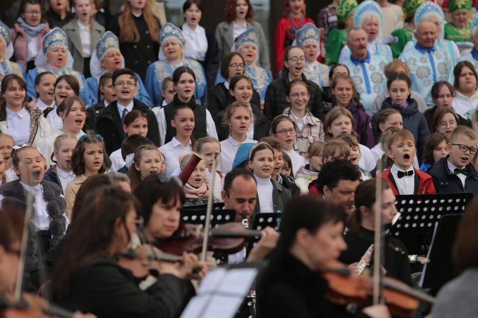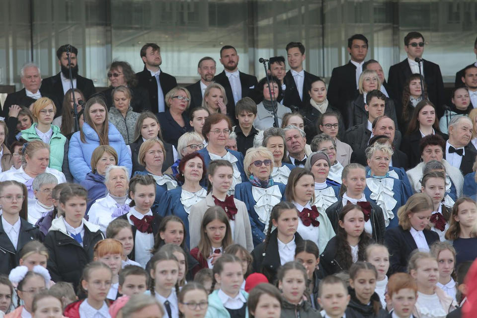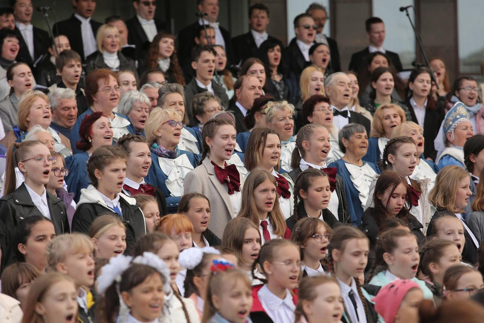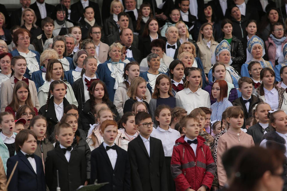 В состав многочисленного сводного хора вошли хоровые коллективы города: детские, студенческие, ветеранские, а также академический хор Губернаторской симфонической капеллы. Управлял сводным хором по традиции Заслуженный деятель искусств России Владимир Каширский.