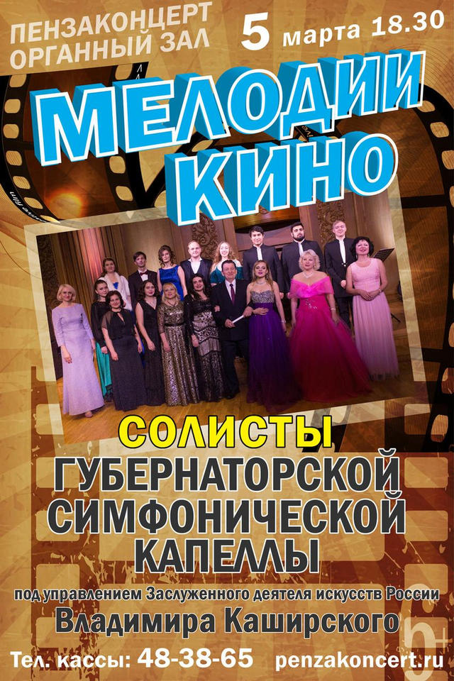 Солисты Губернаторской симфонической капеллы п/у Заслуженного деятеля искусств России Владимира Каширского выступят с программой «Мелодии кино». Артисты исполнят известные песни из любимых отечественных фильмов.