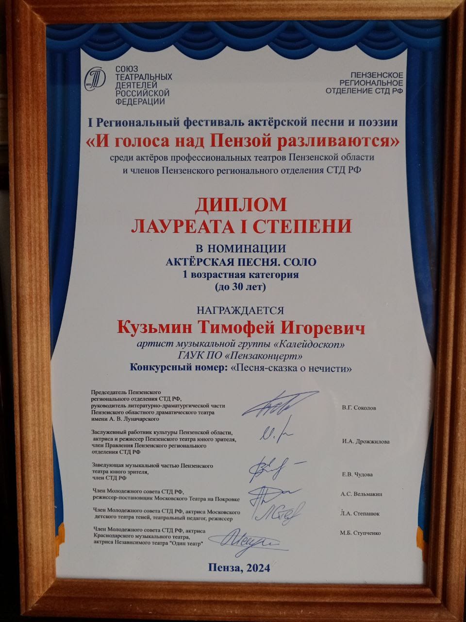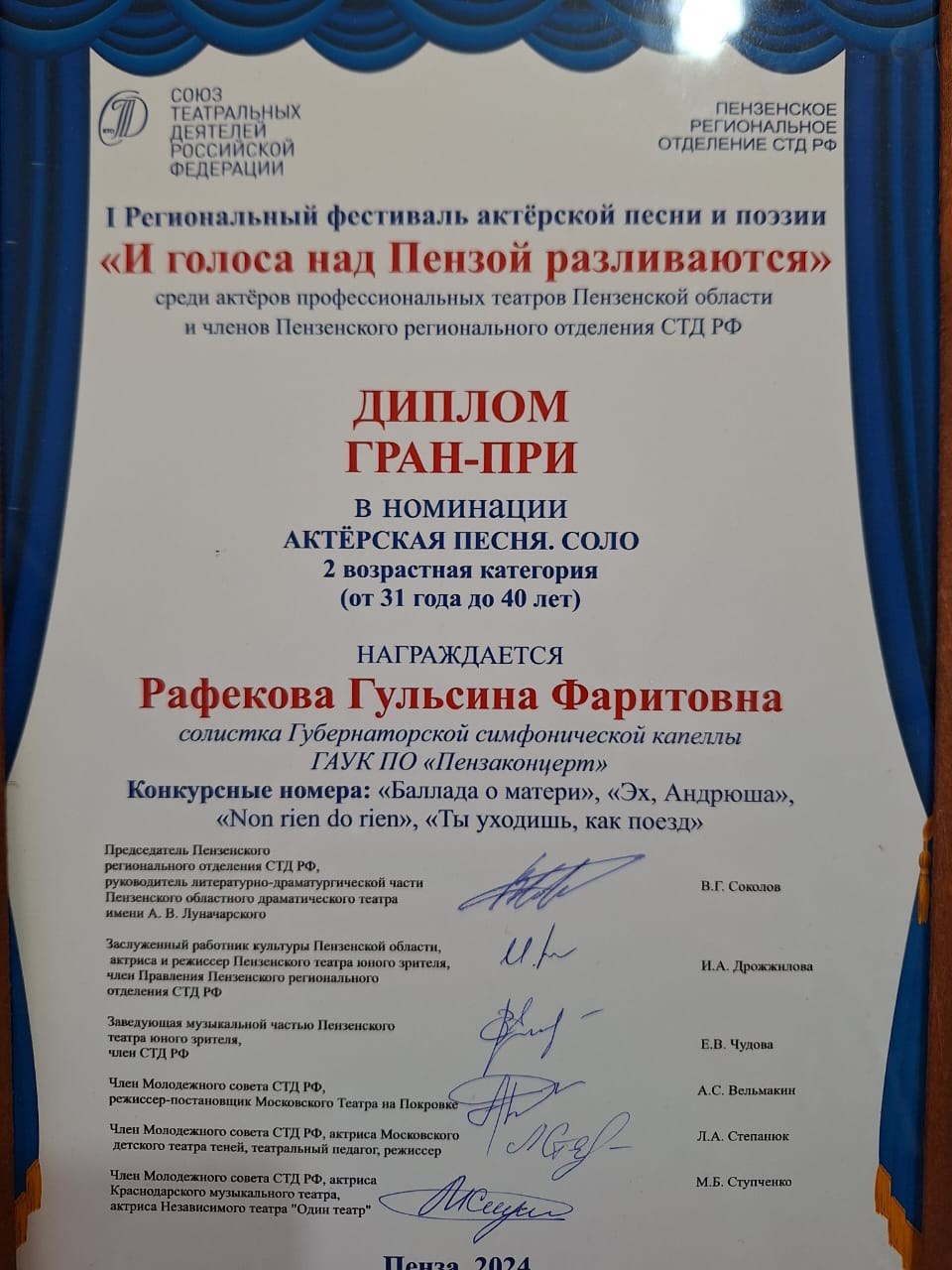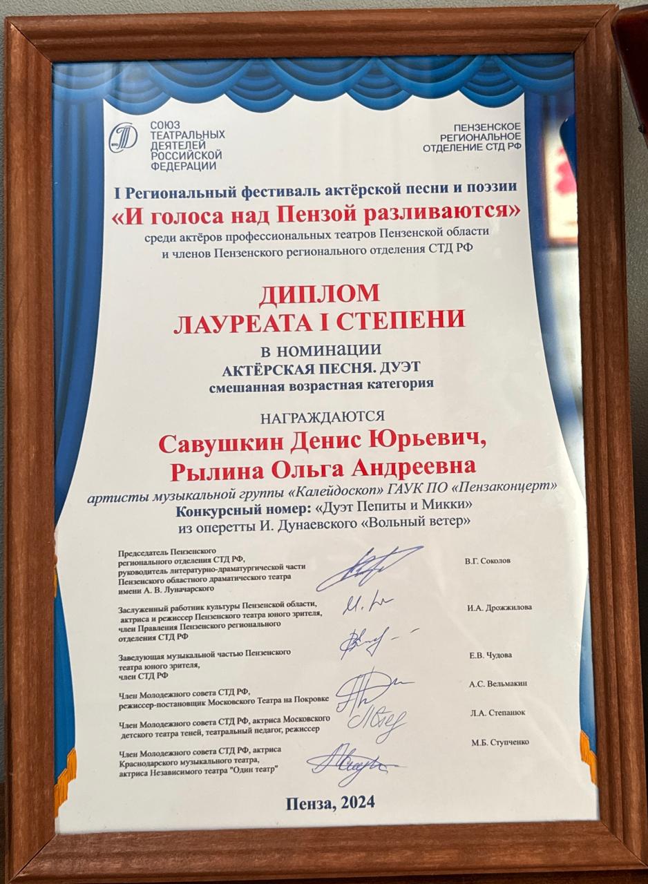 I Региональный фестиваль актерской песни и поэзии «И голоса над Пензой разливаются» состоялся в июне на сцене Пензенского областного драматического театра. Фестиваль был организован Пензенским региональным отделением Союза театральных деятелей России совместно СТД РФ. В фестивале приняли участие артисты ГАУК ПО "Пензаконцерт". Диплом «Гран-При» в номинации «Актерская песня соло» получила солистка Губернаторской симфонической капеллы Гульсина Рафекова, Дипломами Лауреатов I степени награждены артисты группы «Калейдоскоп» Ольга Рылина, Денис Савушкин и Тимофей Кузьмин.