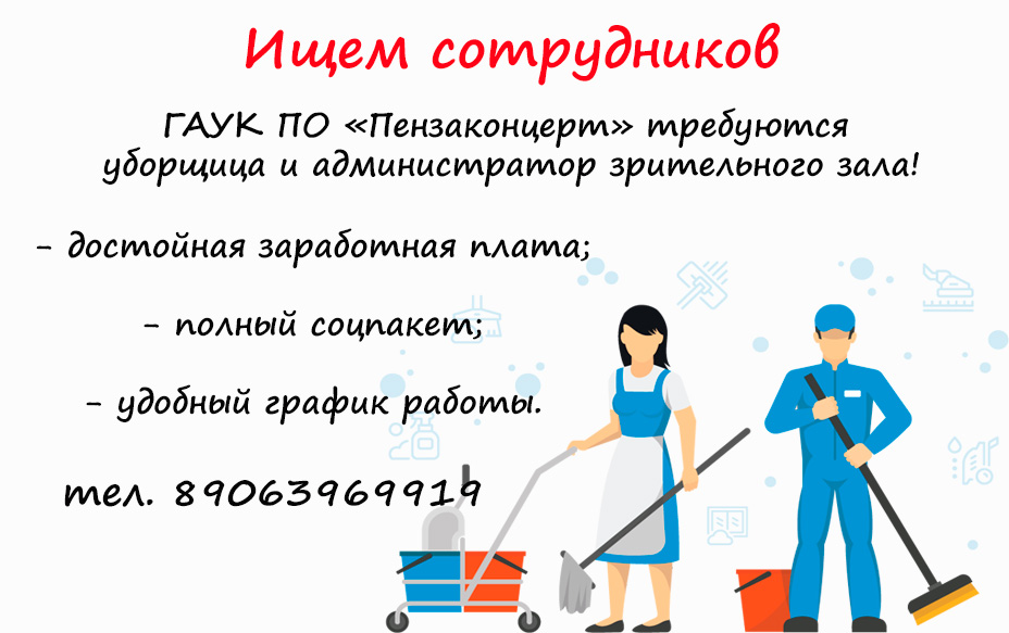 ГАУК ПО «Пензаконцерт» требуется уборщица и администратор по обслуживанию зрителей.