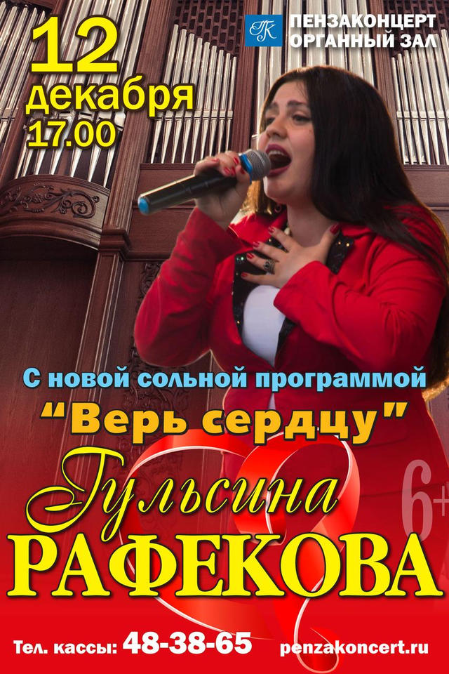 Солистка Губернаторской симфонической капеллы, лауреат всероссийских и международных конкурсов и фестивалей Гульсина Рафекова выступит 12 декабря с сольным концертом. В Органном зале филармонии артистка представит новую программу под названием «Верь сердцу!» (6+).