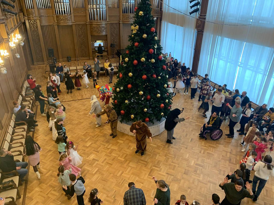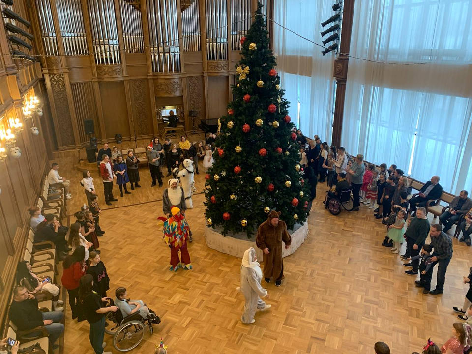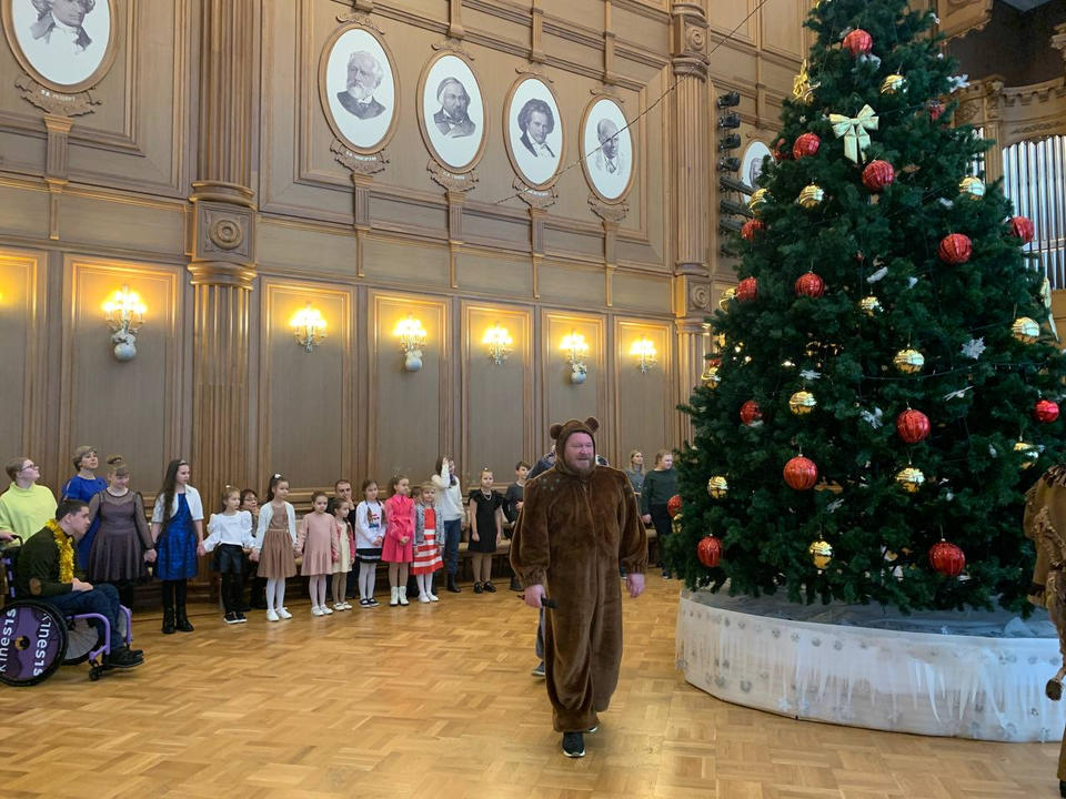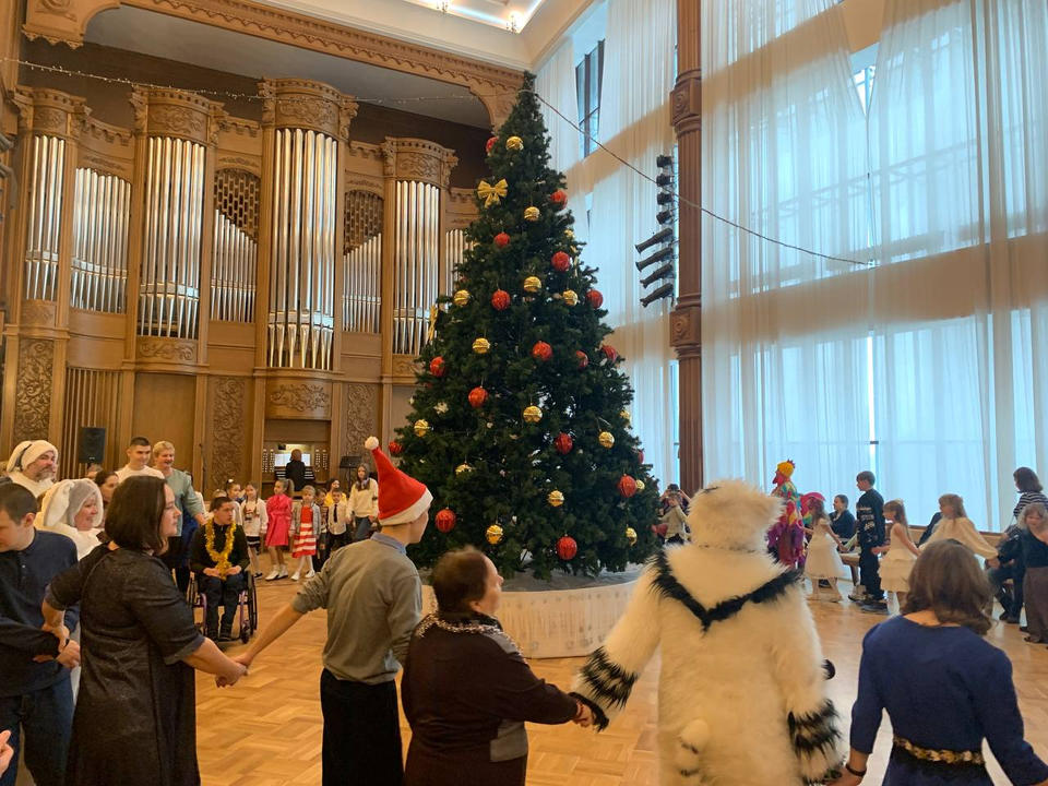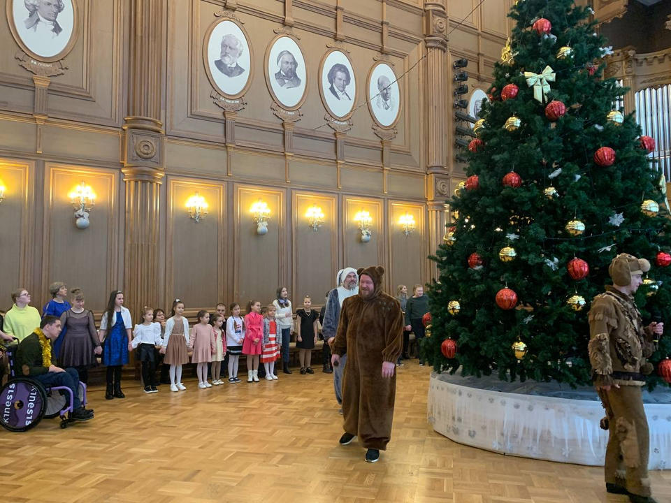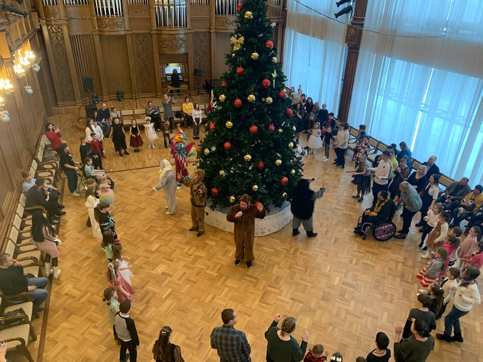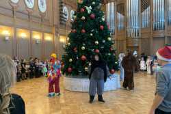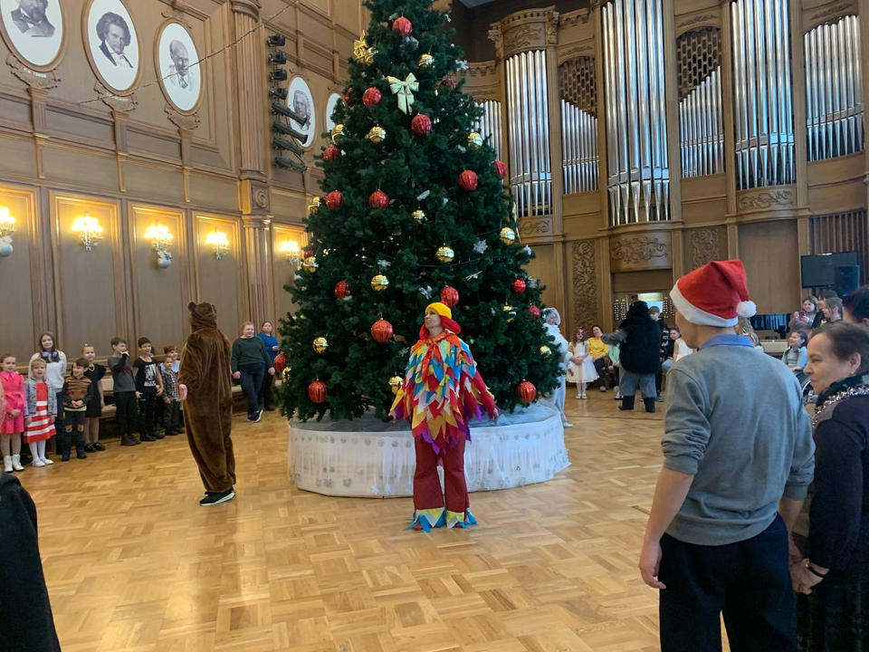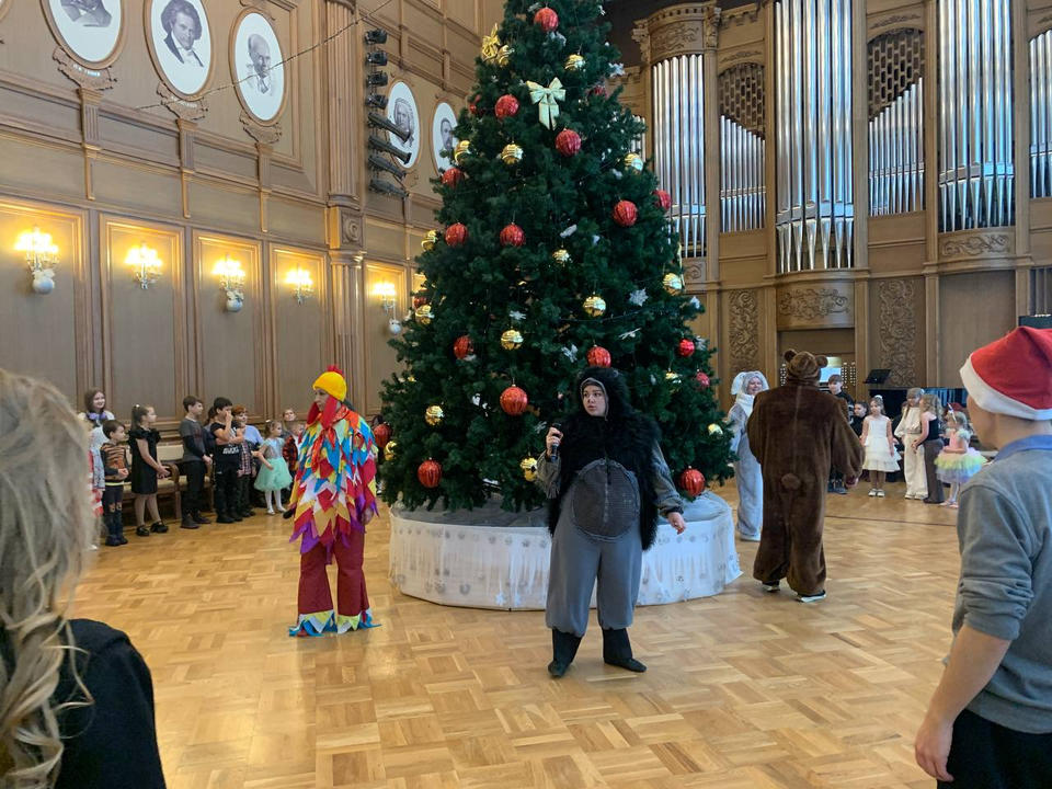 В Органном зале филармонии ребята отгадывали новогодние загадки и пели новогодние песенки в компании веселых животных: зайчиков, мишки, ёжика, собачки, петушка и котика. И, конечно же, водили хоровод вокруг красавицы-ёлки вместе с Дедом Морозом и Снегурочкой. Всё действо сопровождали волшебные звуки органа.