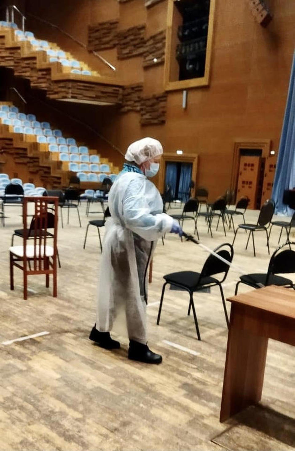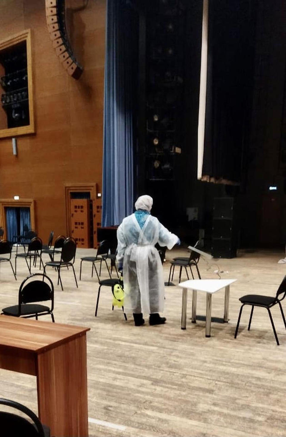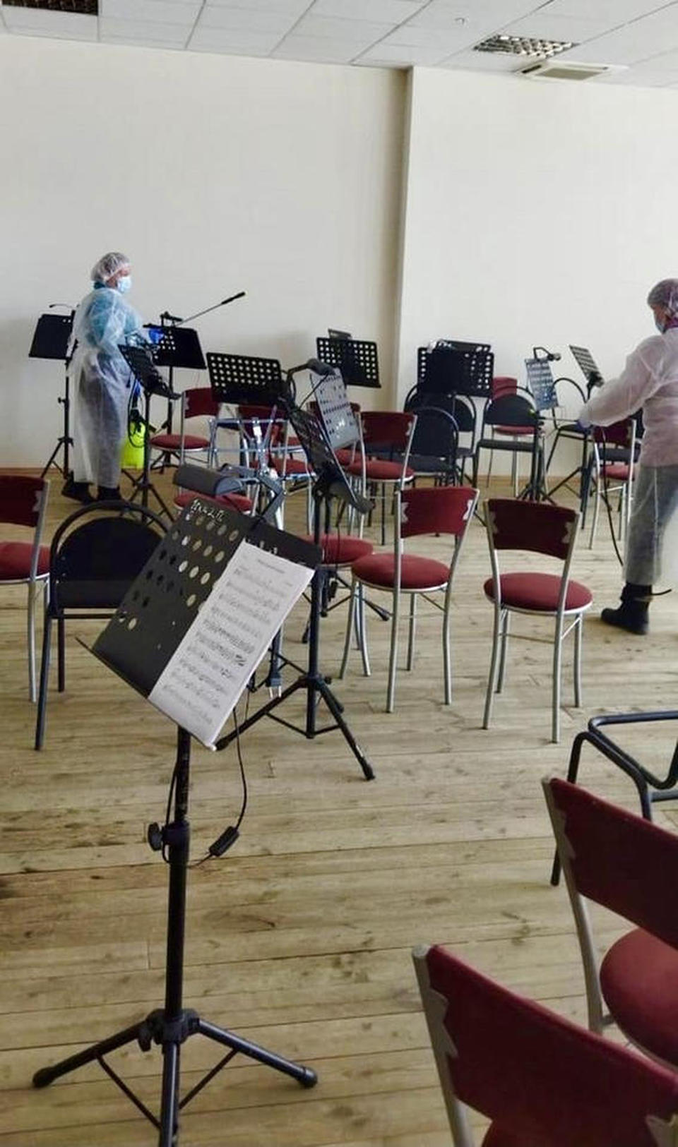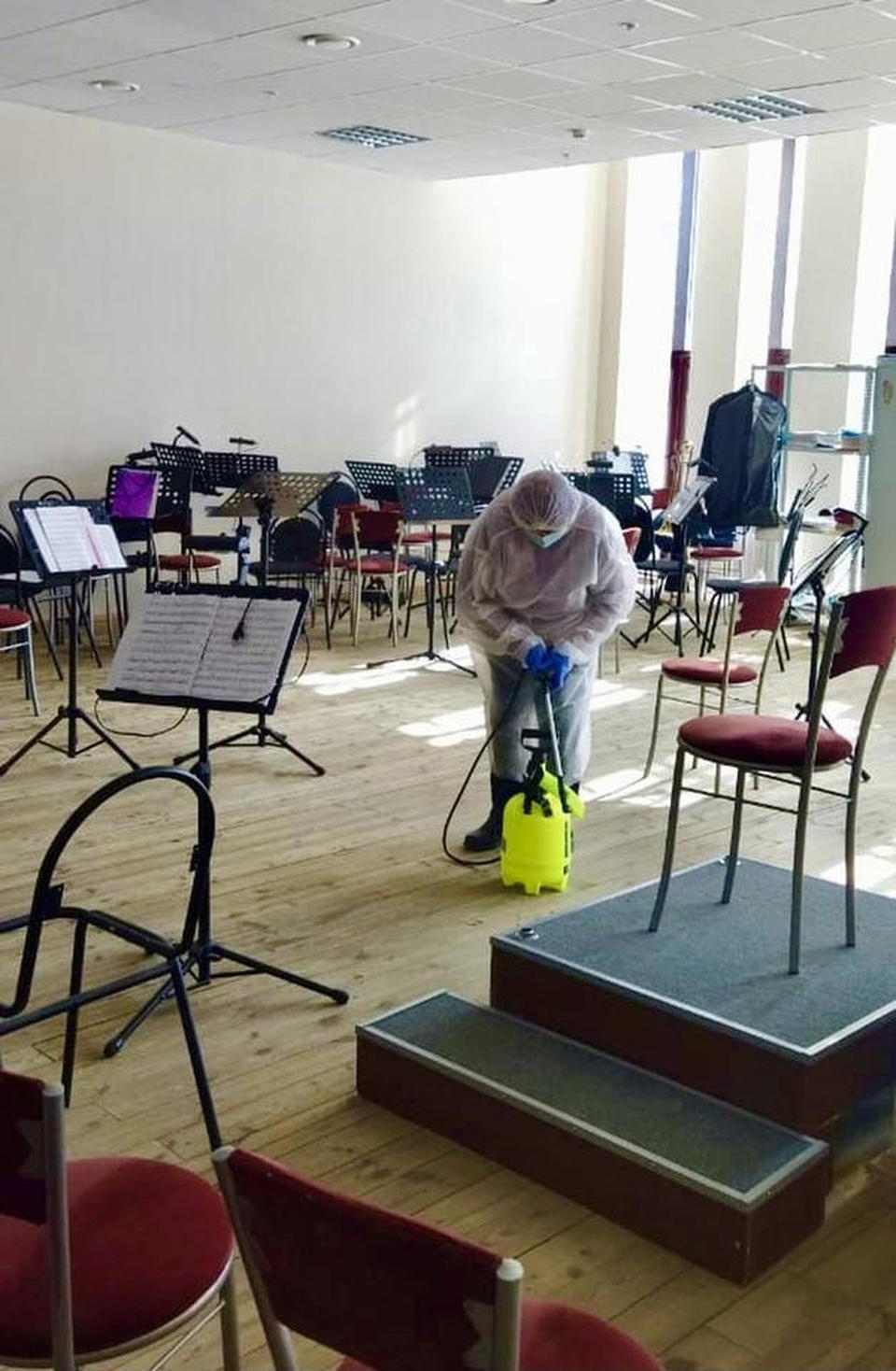 Медицинскими дезинфекторами проведена обработка зрительских залов учреждения культуры, а также репетиционных комнат. При работе были использованы специальные дезинфицирующие средства.