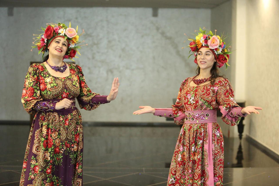 Перед концертом гостей с программой «Добро пожаловать!» встречали солистки ансамбля «Злато-Серебро» – Елена Миронычева и Карина Мещерякова.