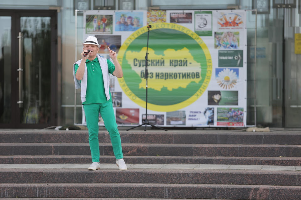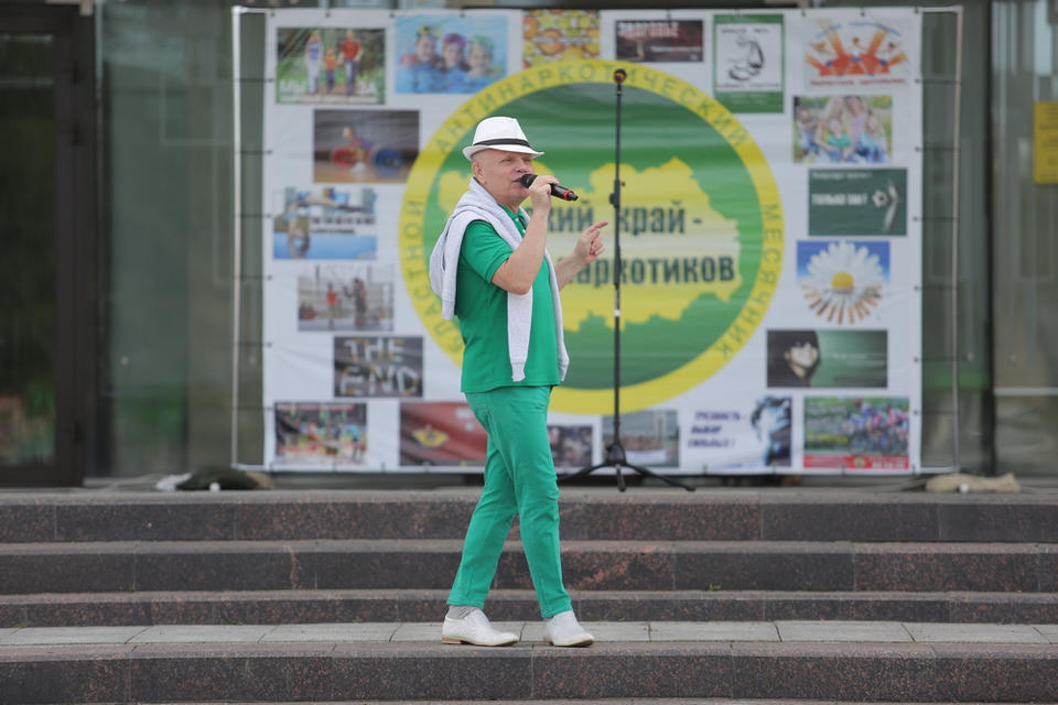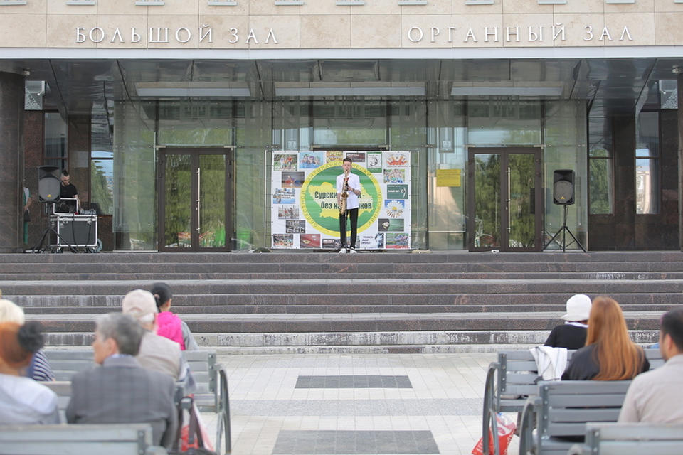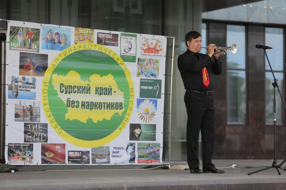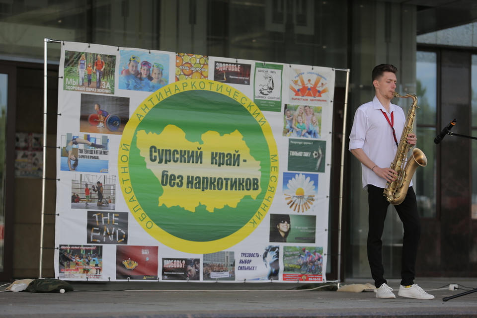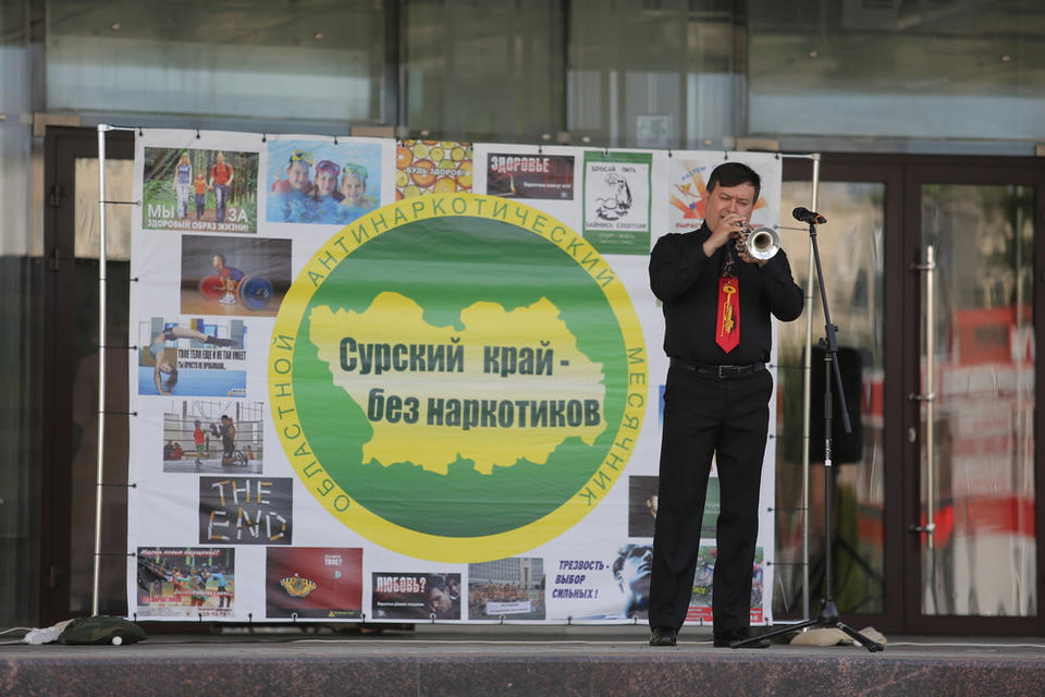 У центрального входа в филармонию состоялась концертная программа «Музыка против наркотиков» в исполнении музыкантов эстрадно-джазового ансамбля «Экспресс-бэнд»: художественного руководителя Юрия Белоногова (труба), Александра Ренуара (вокал) и Семена Бойкова (саксофон).