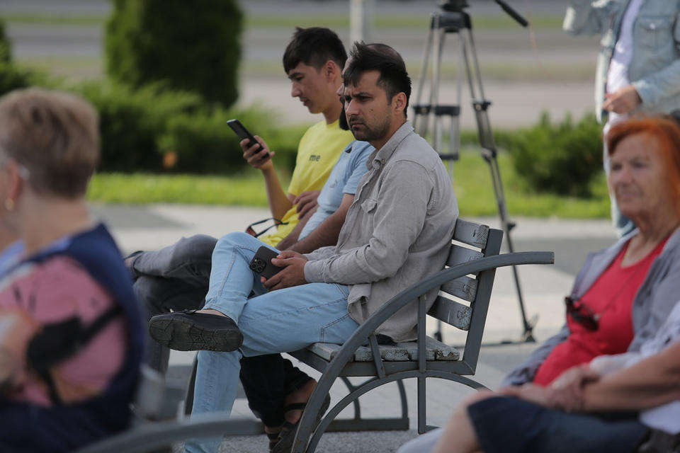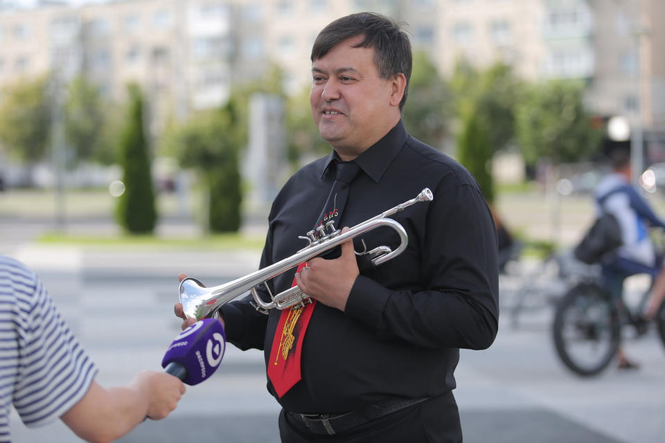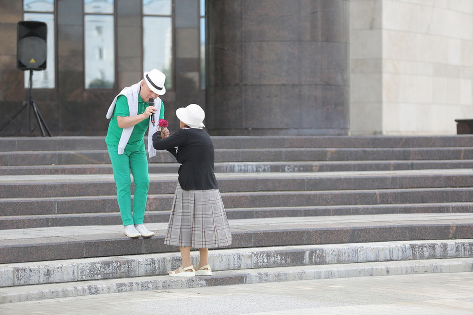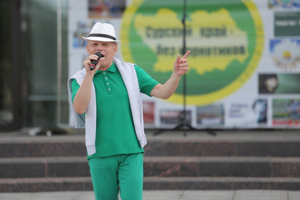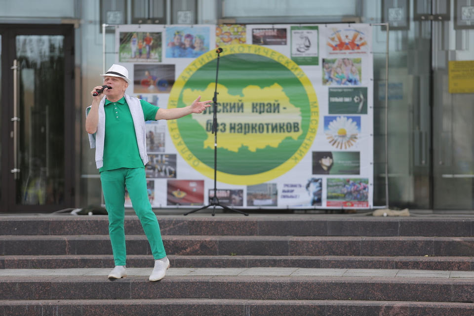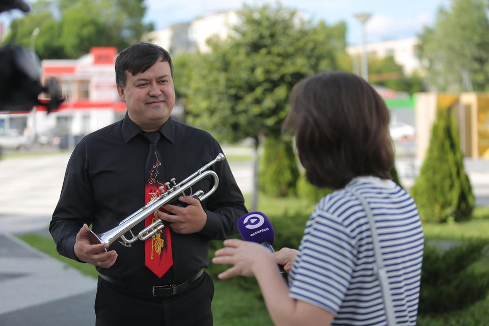 У центрального входа в филармонию состоялась концертная программа «Музыка против наркотиков» в исполнении музыкантов эстрадно-джазового ансамбля «Экспресс-бэнд»: художественного руководителя Юрия Белоногова (труба), Александра Ренуара (вокал) и Семена Бойкова (саксофон).