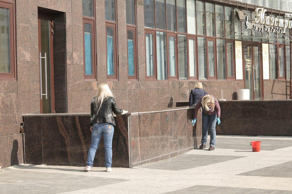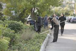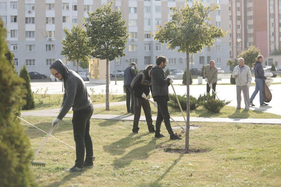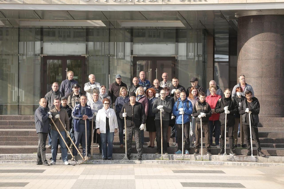 С помощью подручного инвентаря работники, разделившись на бригады, очистили газоны от сухой травы и опавших листьев, а площадь – от мелкого мусора и пыли.
