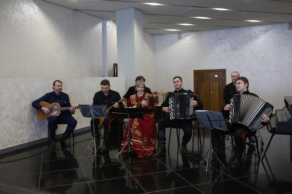 Перед концертом «Мирян» гостей с программой «Добро пожаловать!» встречали музыканты оркестровой группы ансамбля песни и танца «Казачья застава».