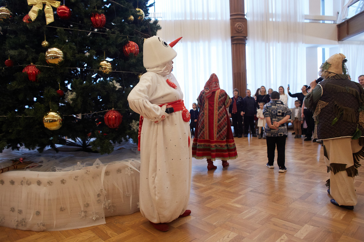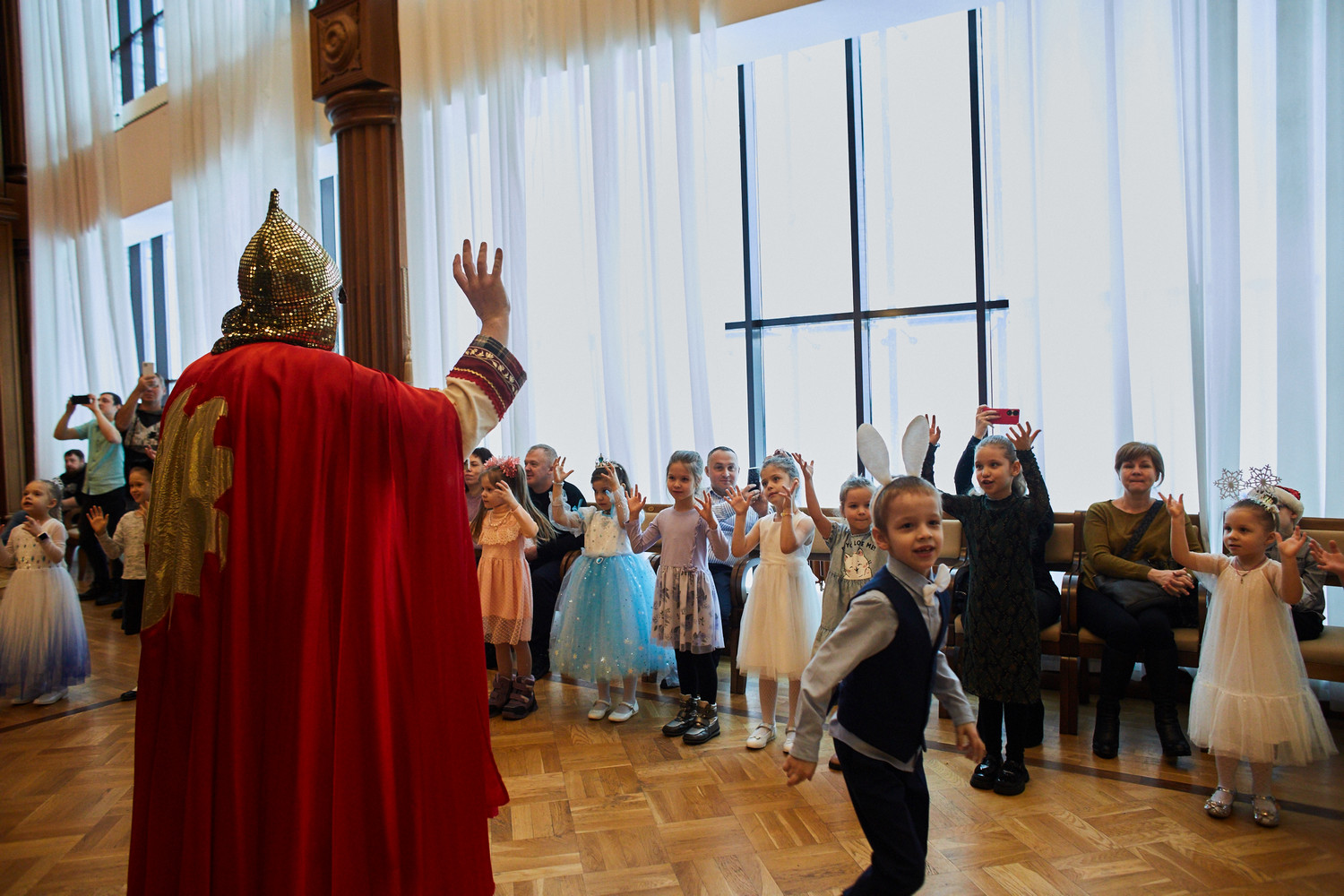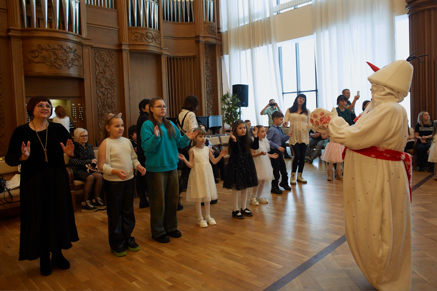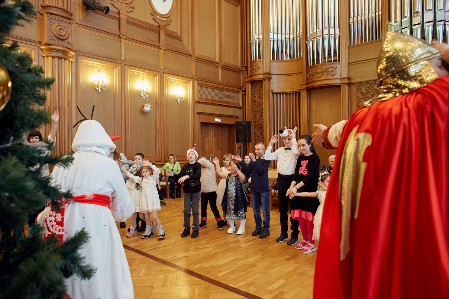 Новогоднее представление началось в Органном зале. Ребята отгадывали новогодние загадки и пели новогодние песни в компании забавных сказочных героев: Снеговика, Кикиморы, Лешего, Бабы Яги, Богатырей и Любавы. Водили хоровод вокруг нарядной ёлки вместе с Дедом Морозом и Снегурочкой. И всё это под волшебные звуки органа.