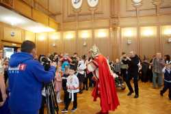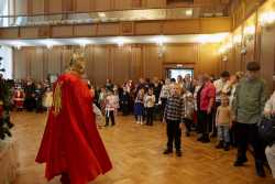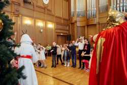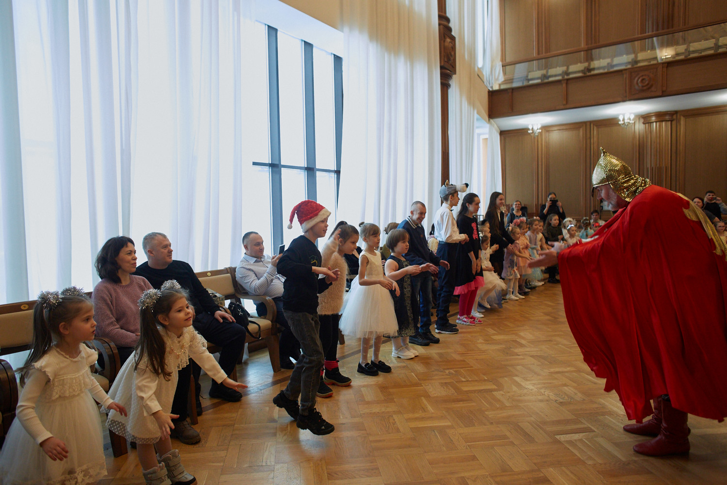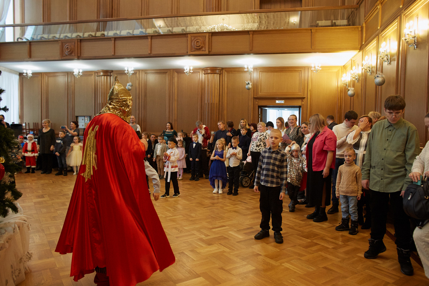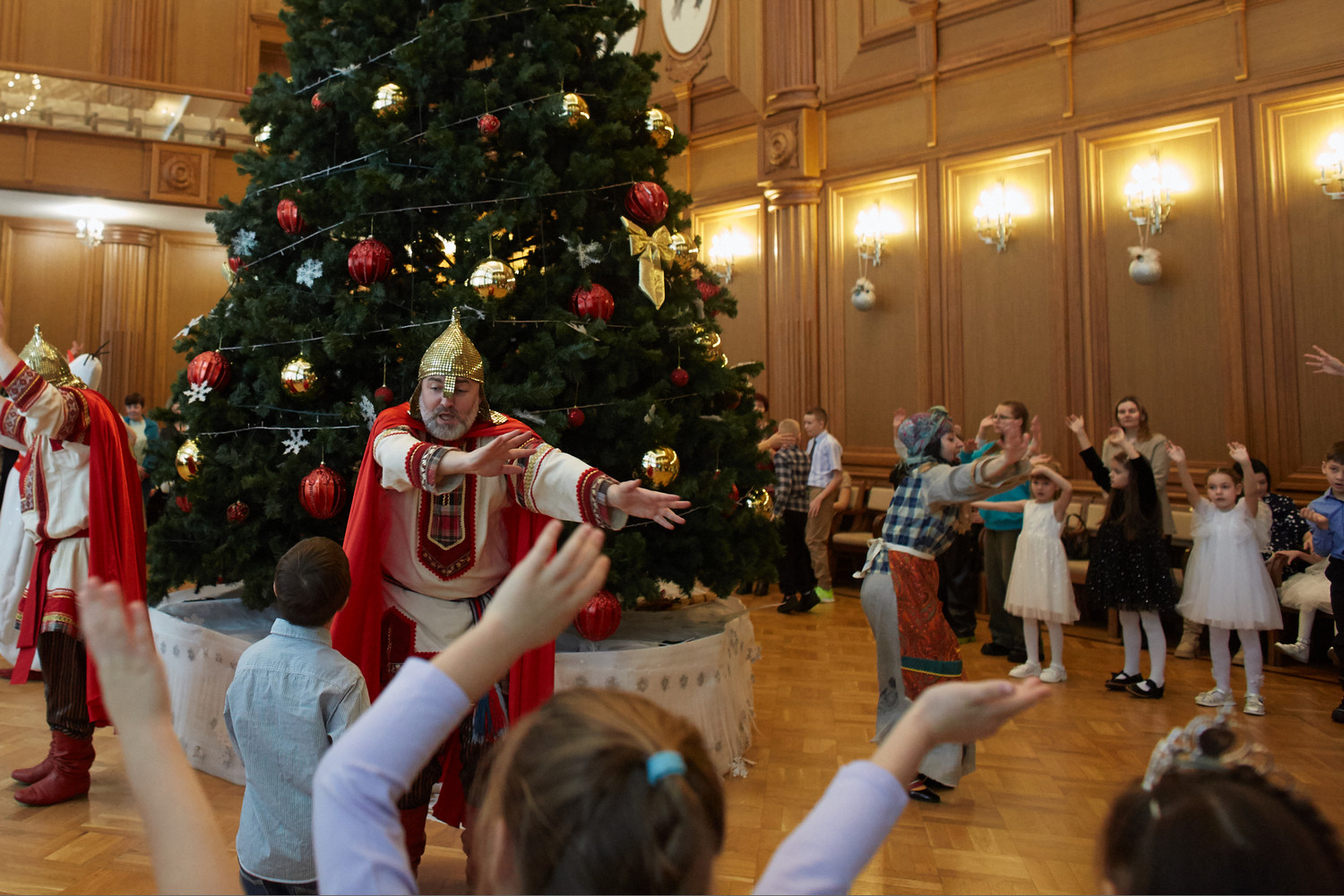 Новогоднее представление началось в Органном зале. Ребята отгадывали новогодние загадки и пели новогодние песни в компании забавных сказочных героев: Снеговика, Кикиморы, Лешего, Бабы Яги, Богатырей и Любавы. Водили хоровод вокруг нарядной ёлки вместе с Дедом Морозом и Снегурочкой. И всё это под волшебные звуки органа.