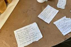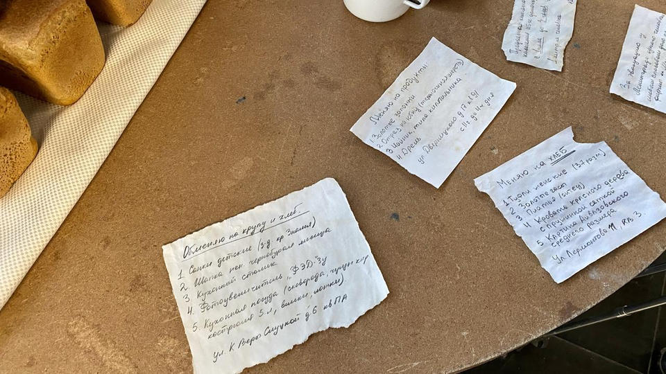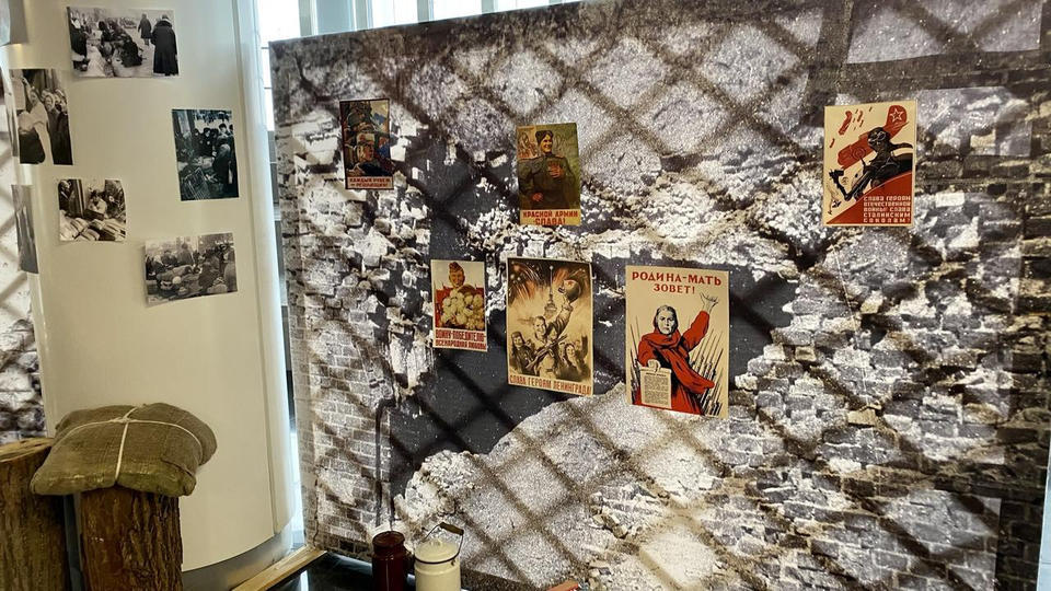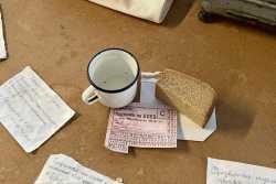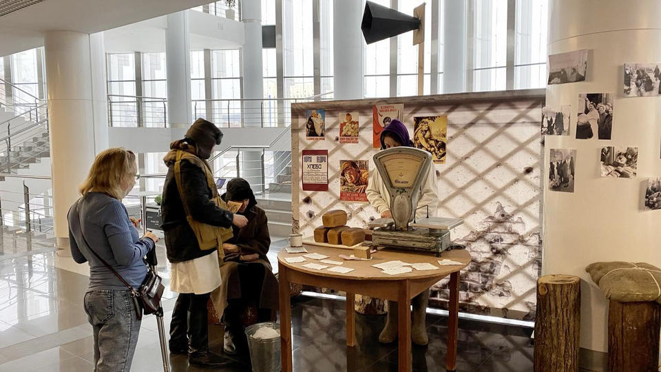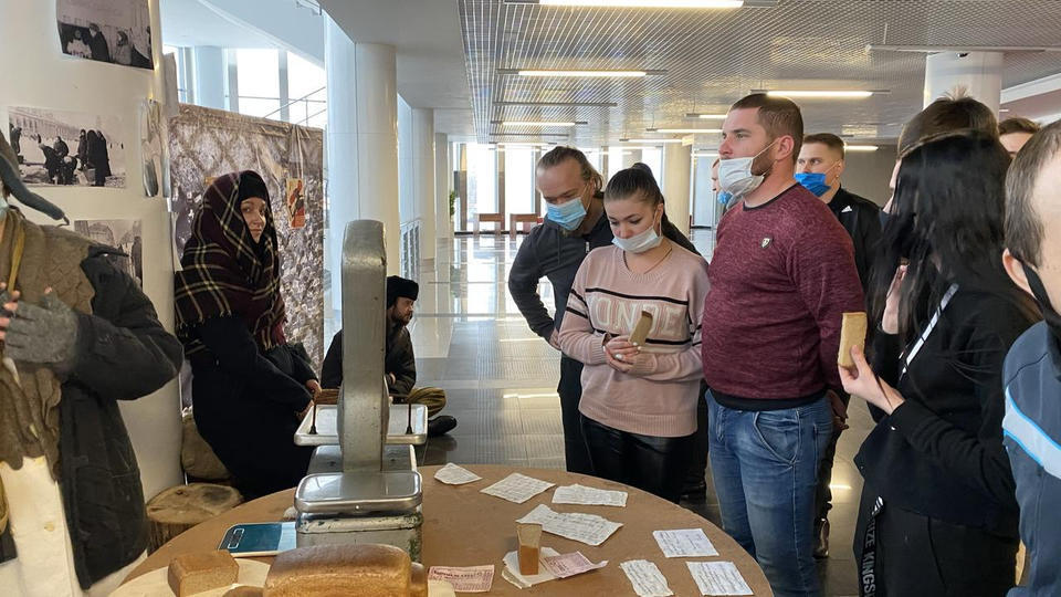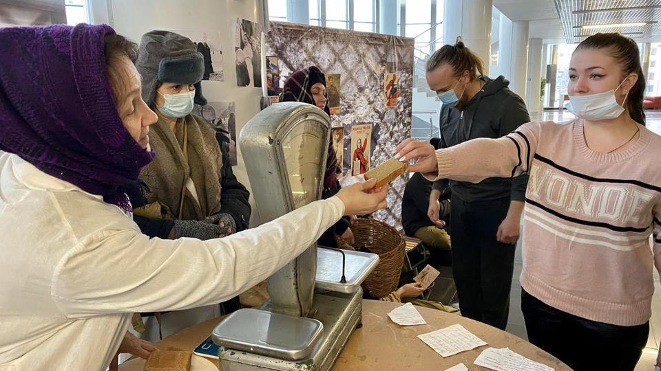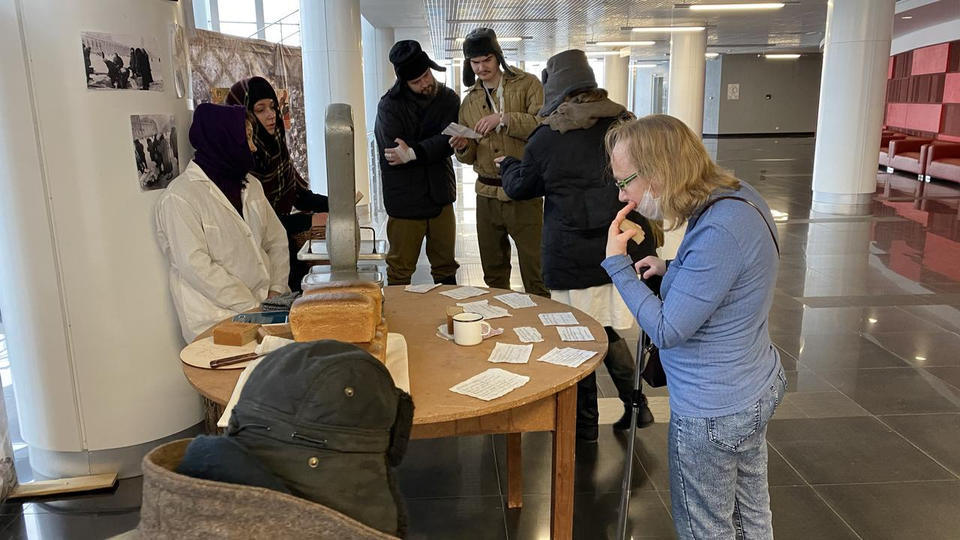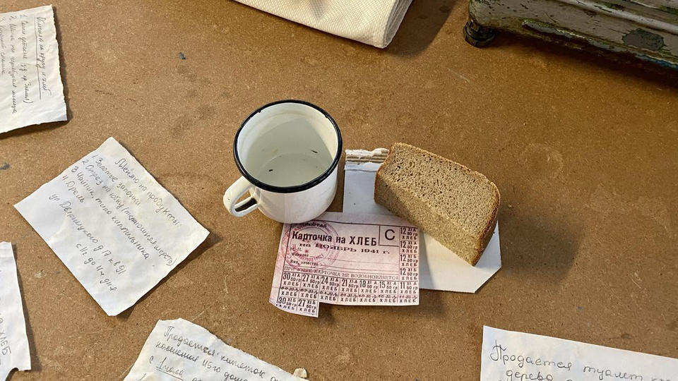 …В центре площадки стоит деревянный стол, на котором расположены весы и деревянная разделочная доска, на ней – кусочек хлеба весом 125 граммов и карточки на хлеб. Здесь же стоит алюминиевая посуда, наполненная снегом – талой водой. За столом стоит девушка в белом халате и пуховой шали и нарезает хлеб, рассказывая зрителям о блокадном хлебе.