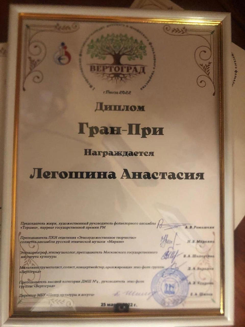 Артистка ансамбля русской этнической музыки «Миряне» Анастасия Легошина удостоена Гран-При I Всероссийского фестиваля-конкурса детского и юношеского фольклорного творчества «Вертоград», который проходил в Пензе 25 марта.