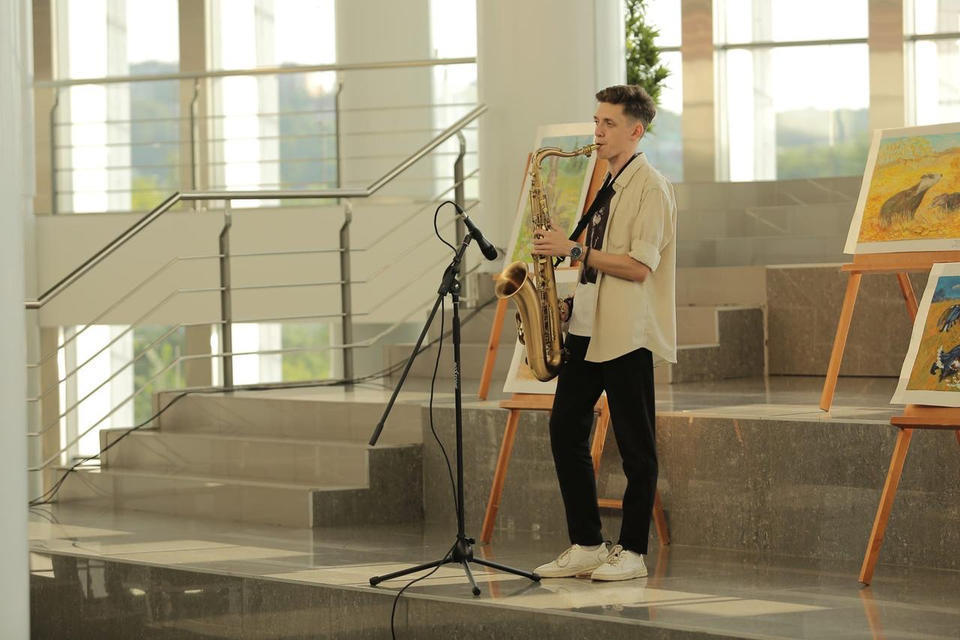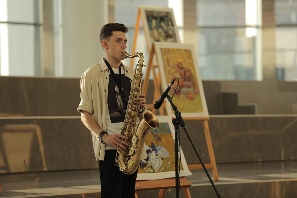 Перед концертом зрителей с программой «Добро пожаловать!» встречал музыкант эстрадно-джазового ансамбля «Экспресс-бэнд» Семён Бойков (саксофон).