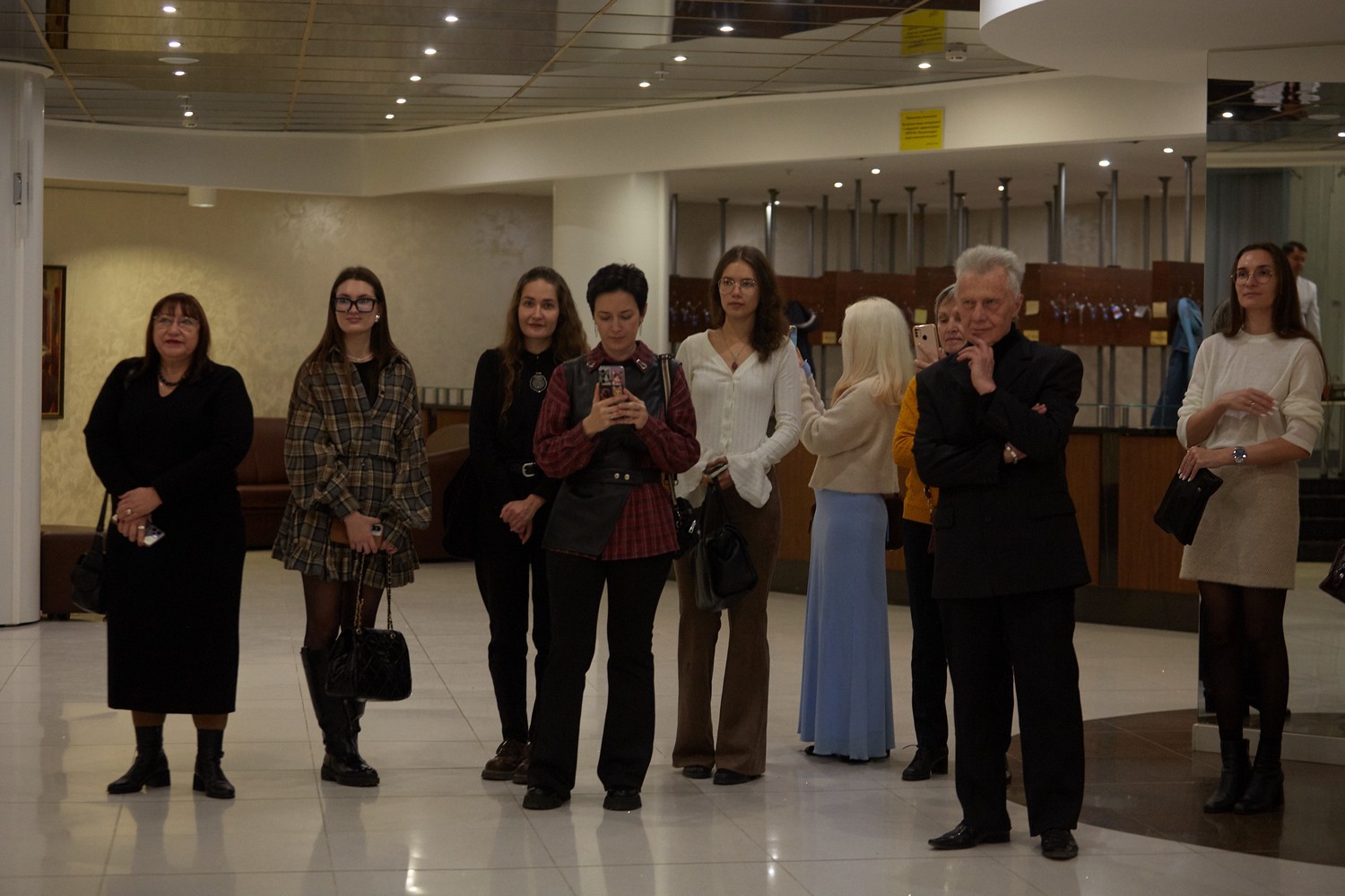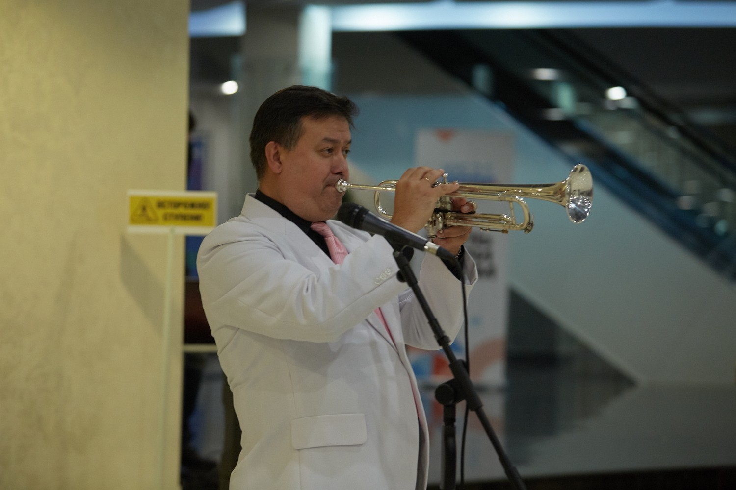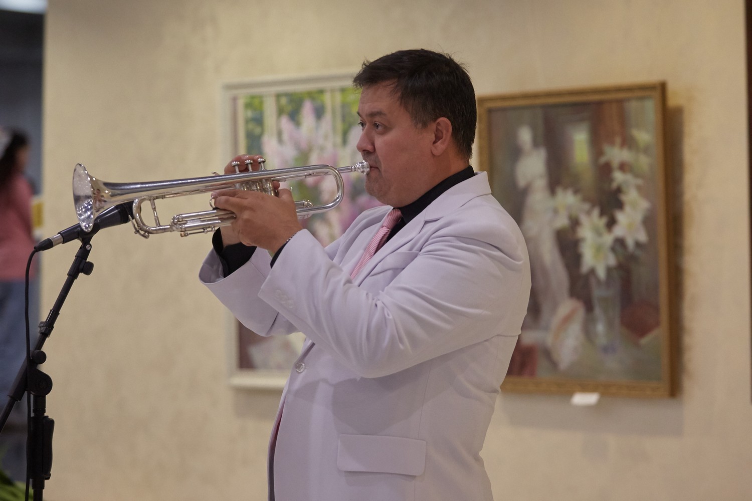С музыкальным сопровождением выставки выступил художественный руководитель эстрадно-джазового ансамбля «Экспресс-бэнд» Юрий Белоногов (труба).