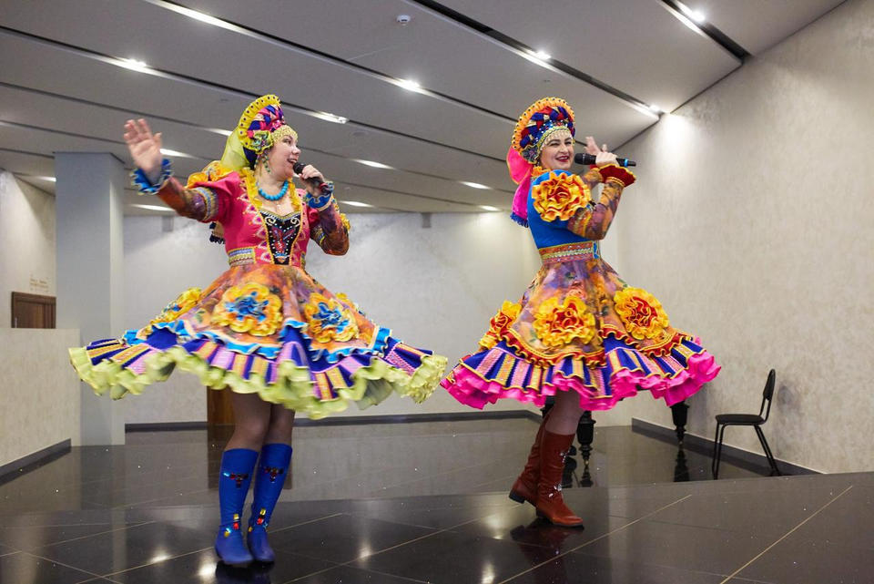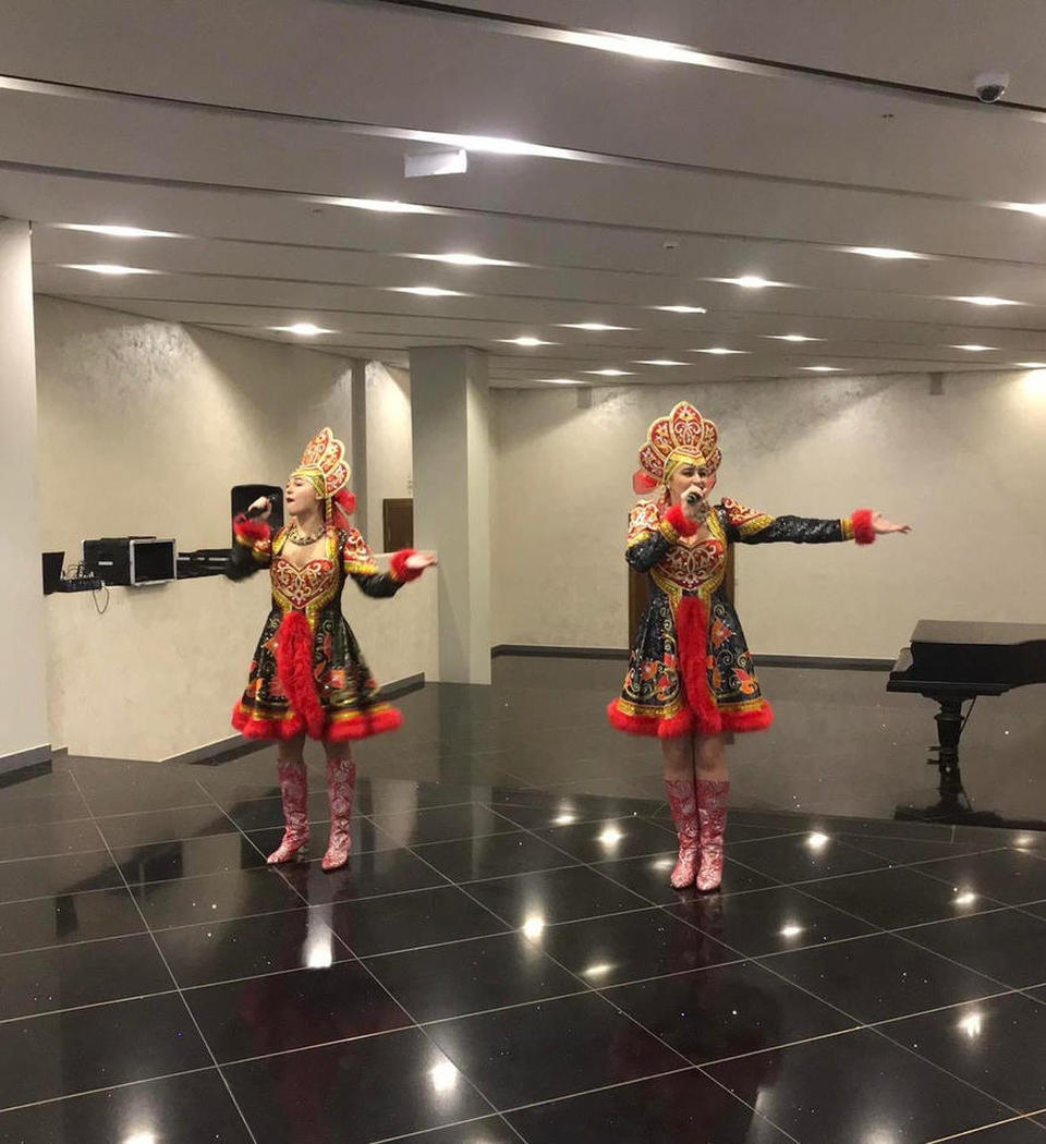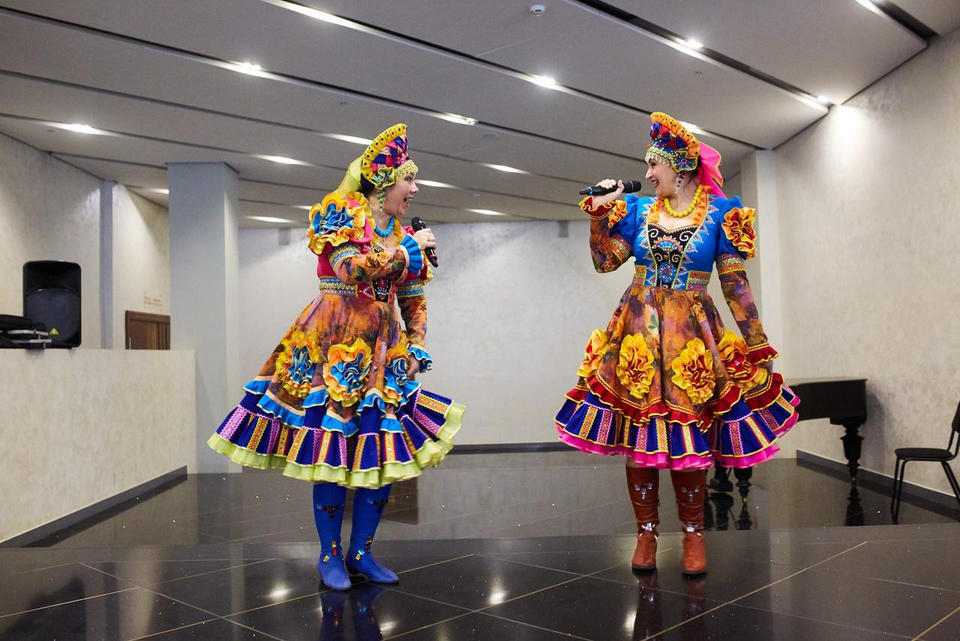 В фойе филармонии юных зрителей и их родителей с программой «Весёлые нотки» встречали артисты ансамбля «Злато-Серебро».