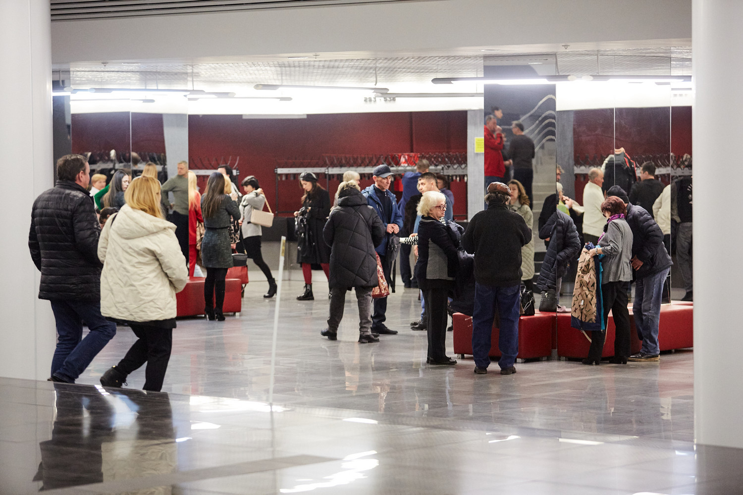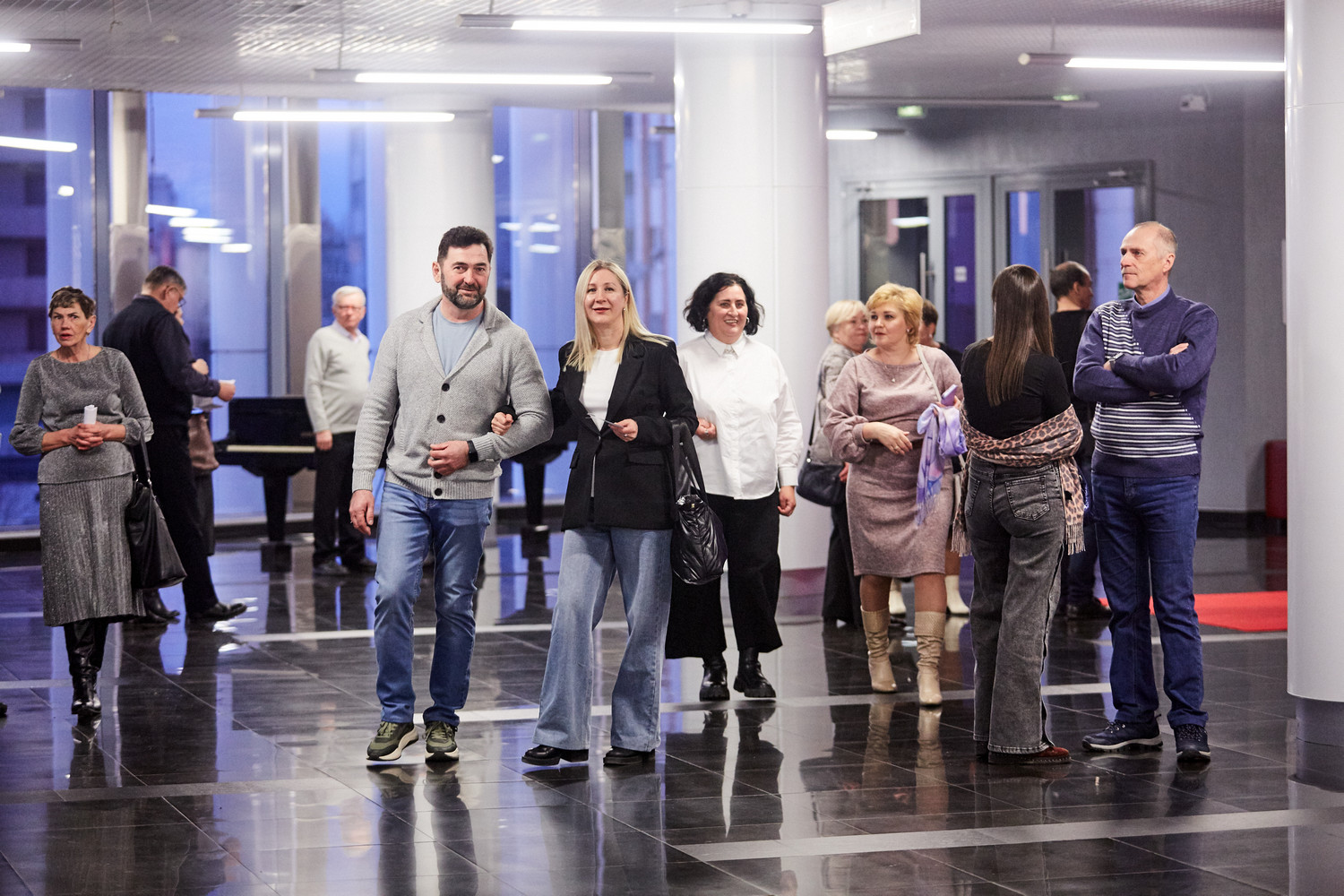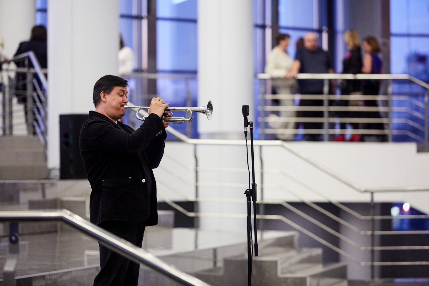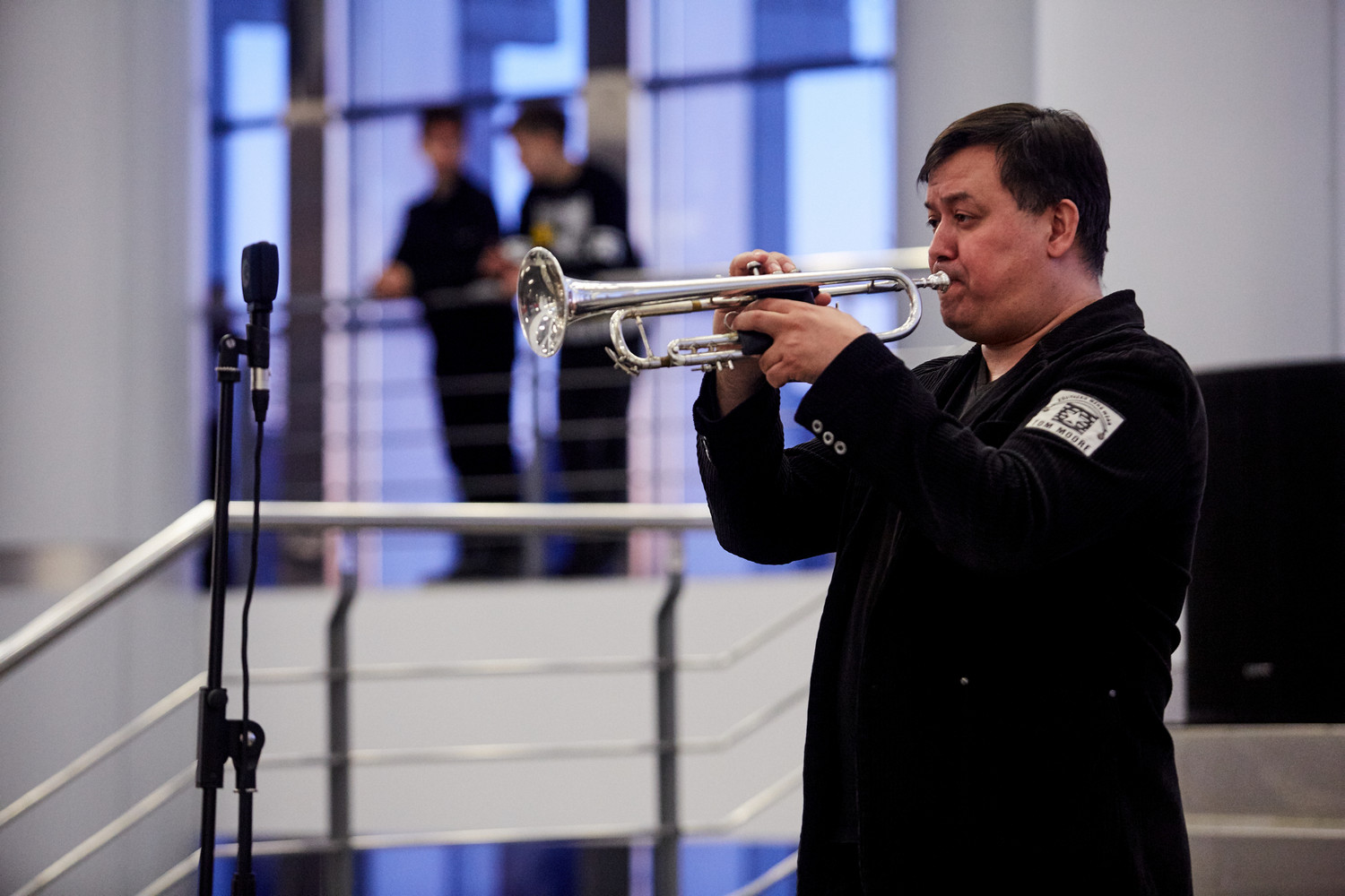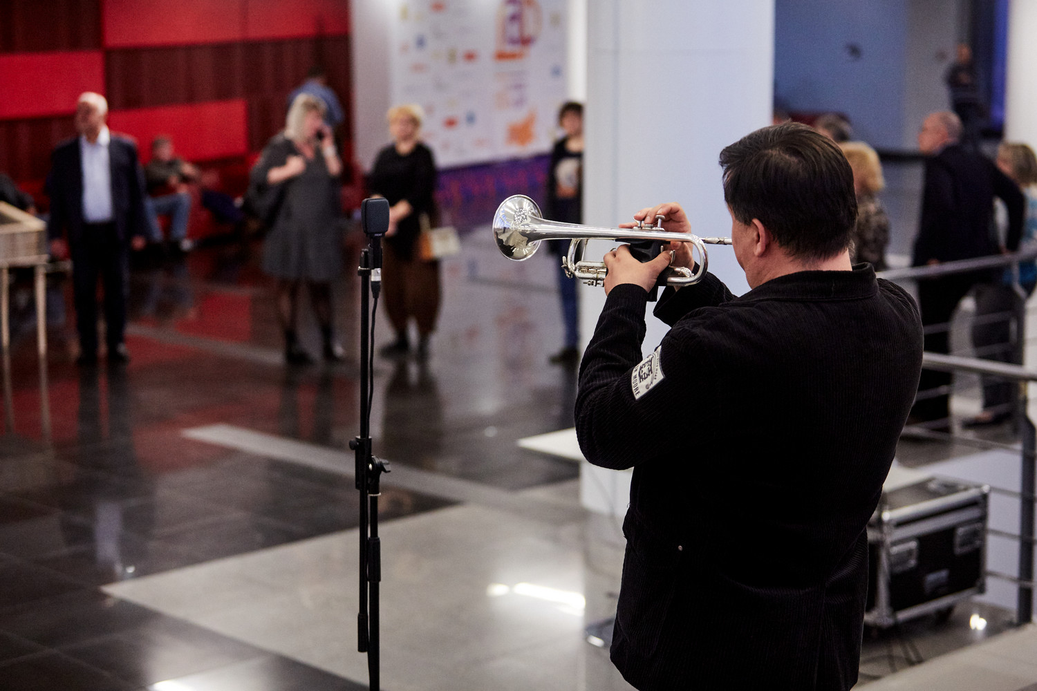 В фойе второго этажа гостей встречал руководитель эстрадно-джазового ансамбля «Экспресс-бэнд» Юрий Белоногов (труба).