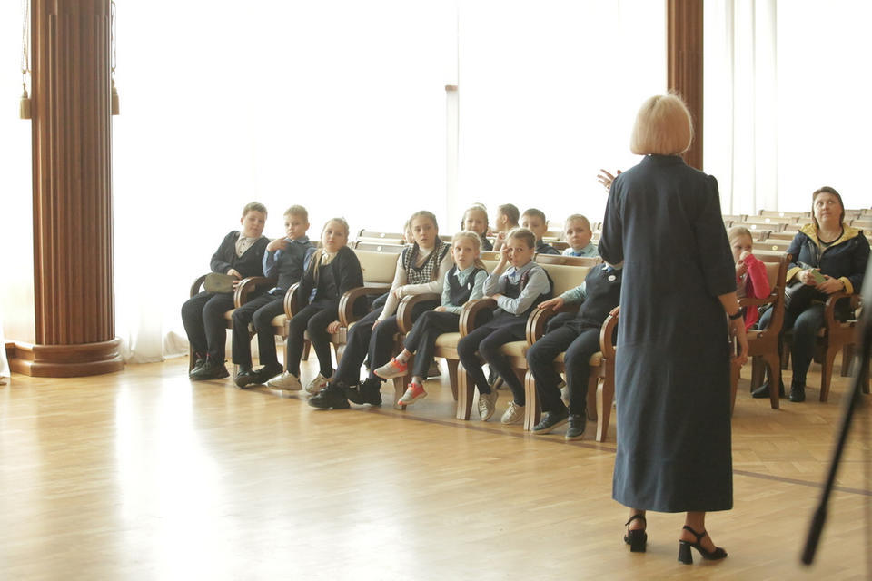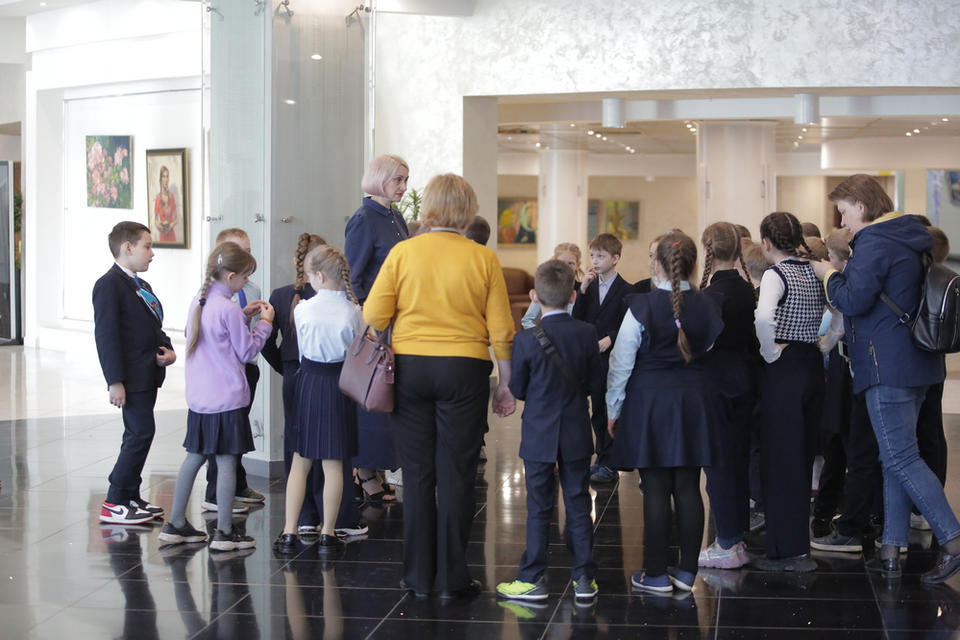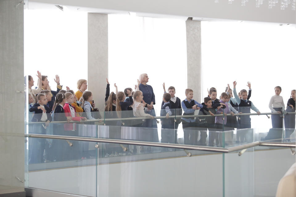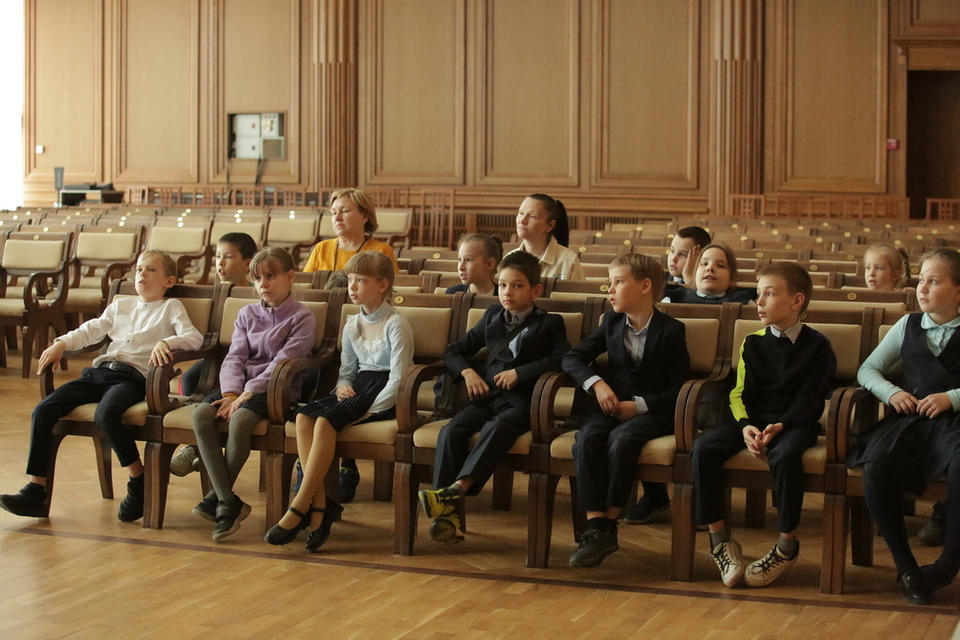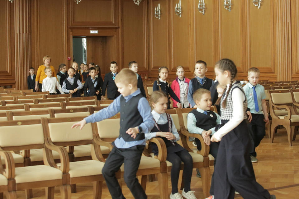 Для ребят был проведен экскурсионный маршрут, в ходе которого школьники узнали об архитектурных особенностях здания и его внутренней отделки, поднялись на сцену Большого зала, где сделали общее фото.