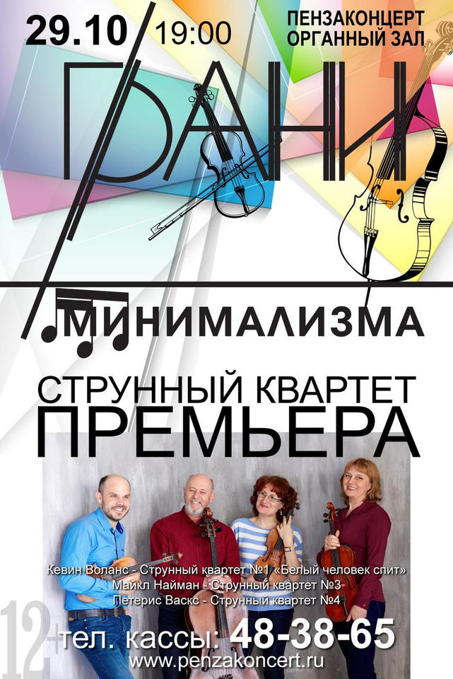 Струнный квартет «Премьера» приглашает на сольный концерт! 29 октября музыканты представят программу под названием «Грани минимализма», в которую войдут сочинения Кевина Воланса, Майкла Наймана и Петериса Васкса.
