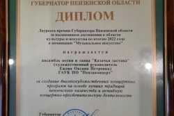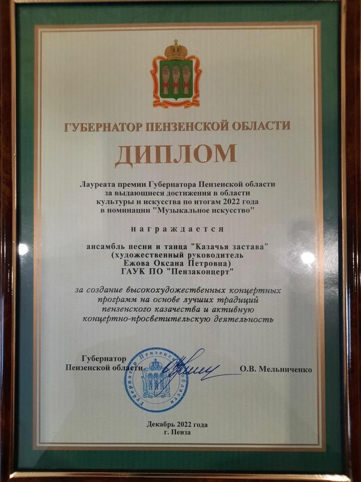Премии Губернатора за выдающиеся достижения в области культуры в номинации «Музыкальное искусство» удостоен ансамбль песни и танца «Казачья застава» ГАУК ПО «Пензаконцерт». Художественный руководитель – Оксана Ежова.
