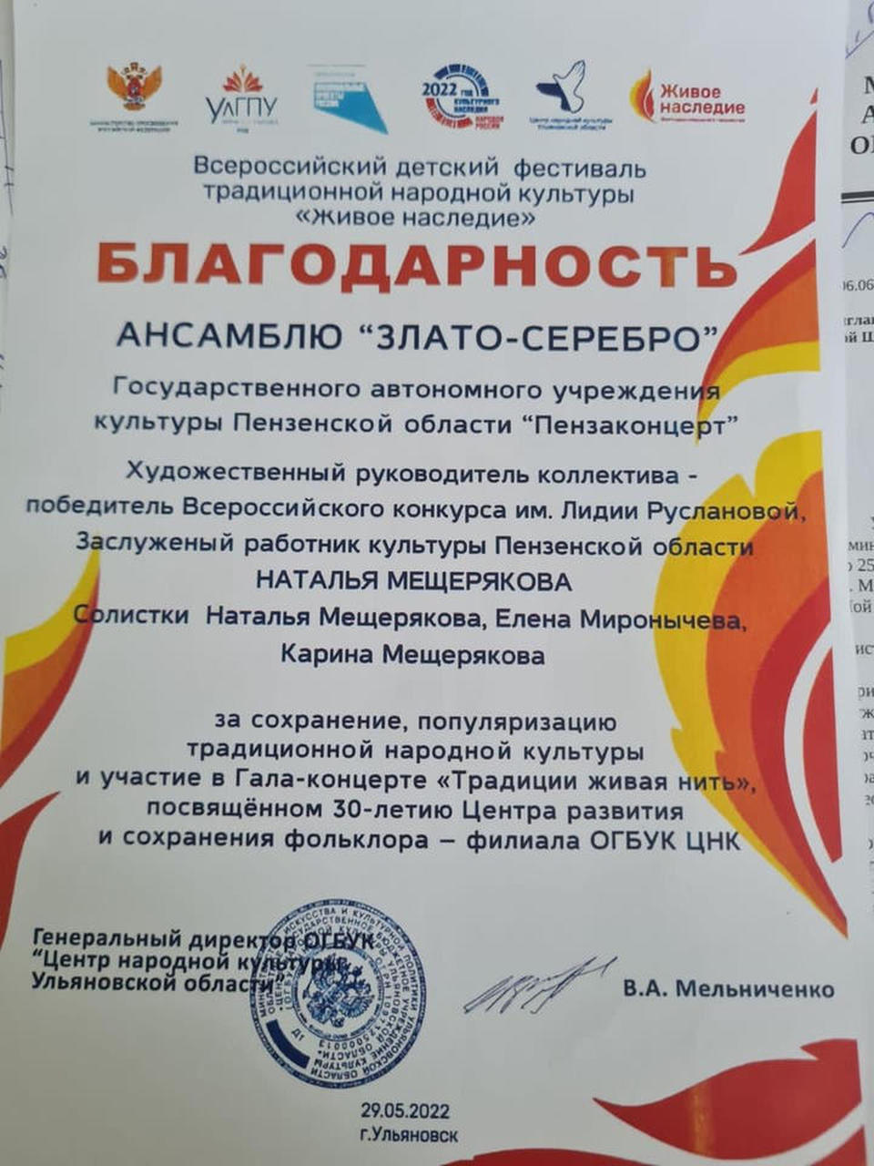 Заслуженный работник Пензенской области Наталья Мещерякова и ансамбль «Злато-Серебро» выступили 29 мая в Ульяновске.