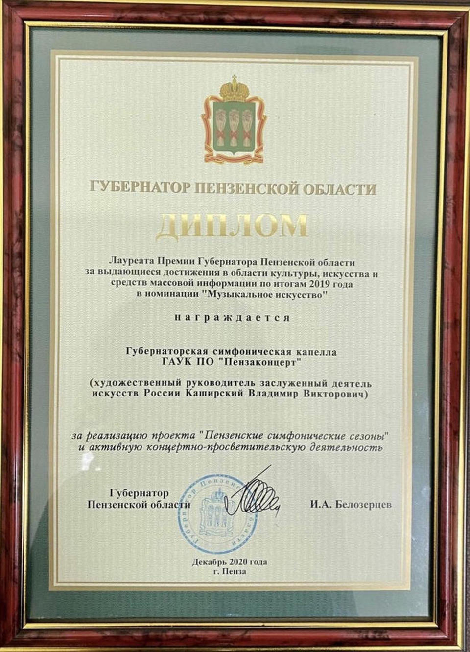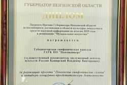 В номинации «Музыкальное искусство» премии удостоена Губернаторская симфоническая капелла п/у Заслуженного деятеля искусств России Владимира Каширского за активную концертно-просветительскую деятельность и реализацию проекта «Пензенские симфонические сезоны».