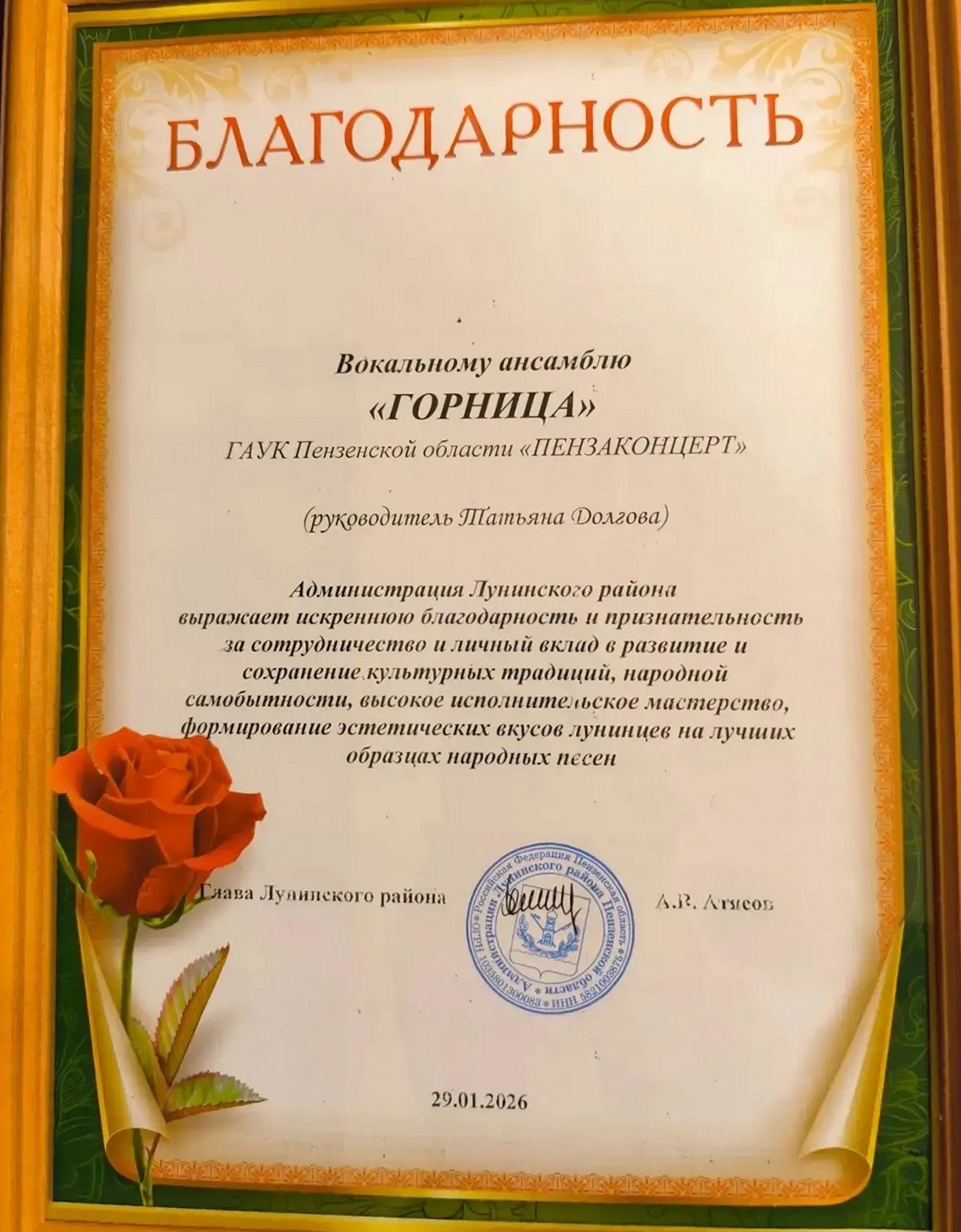 За вклад в культурную жизнь района и сохранение народных традиций коллектив получил Благодарность от администрации Лунинского района. Награду вручила председатель Лунинского отделения Союза женщин России и главный редактор газеты «Сурская правда» Надежда Чернышова.
