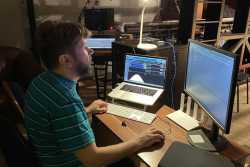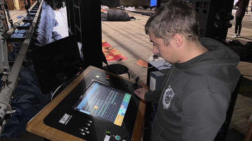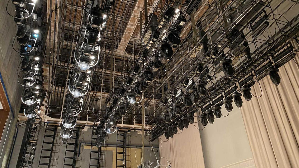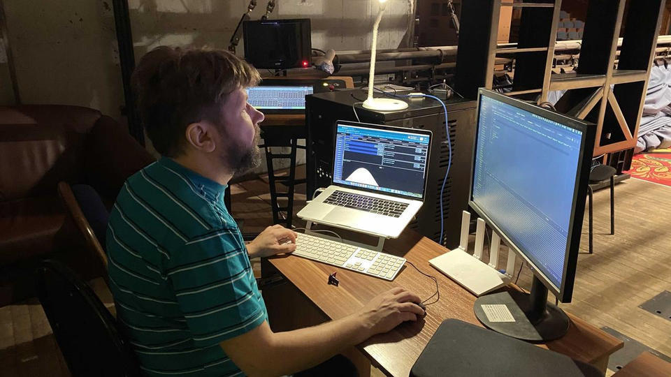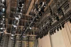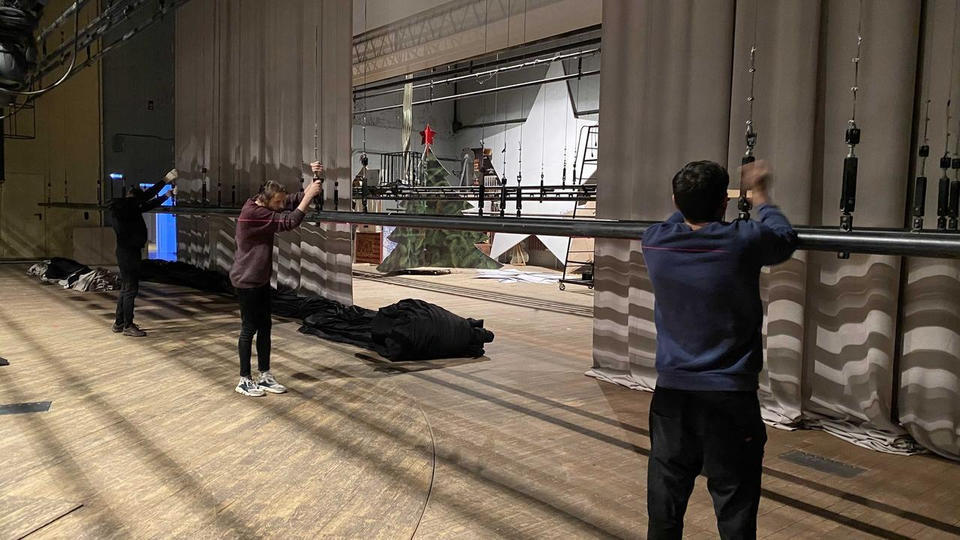 Приглашённые специалисты и технический персонал «Пензаконцерта» заняты настройкой и обновлением комплекса механического оборудования сцены.